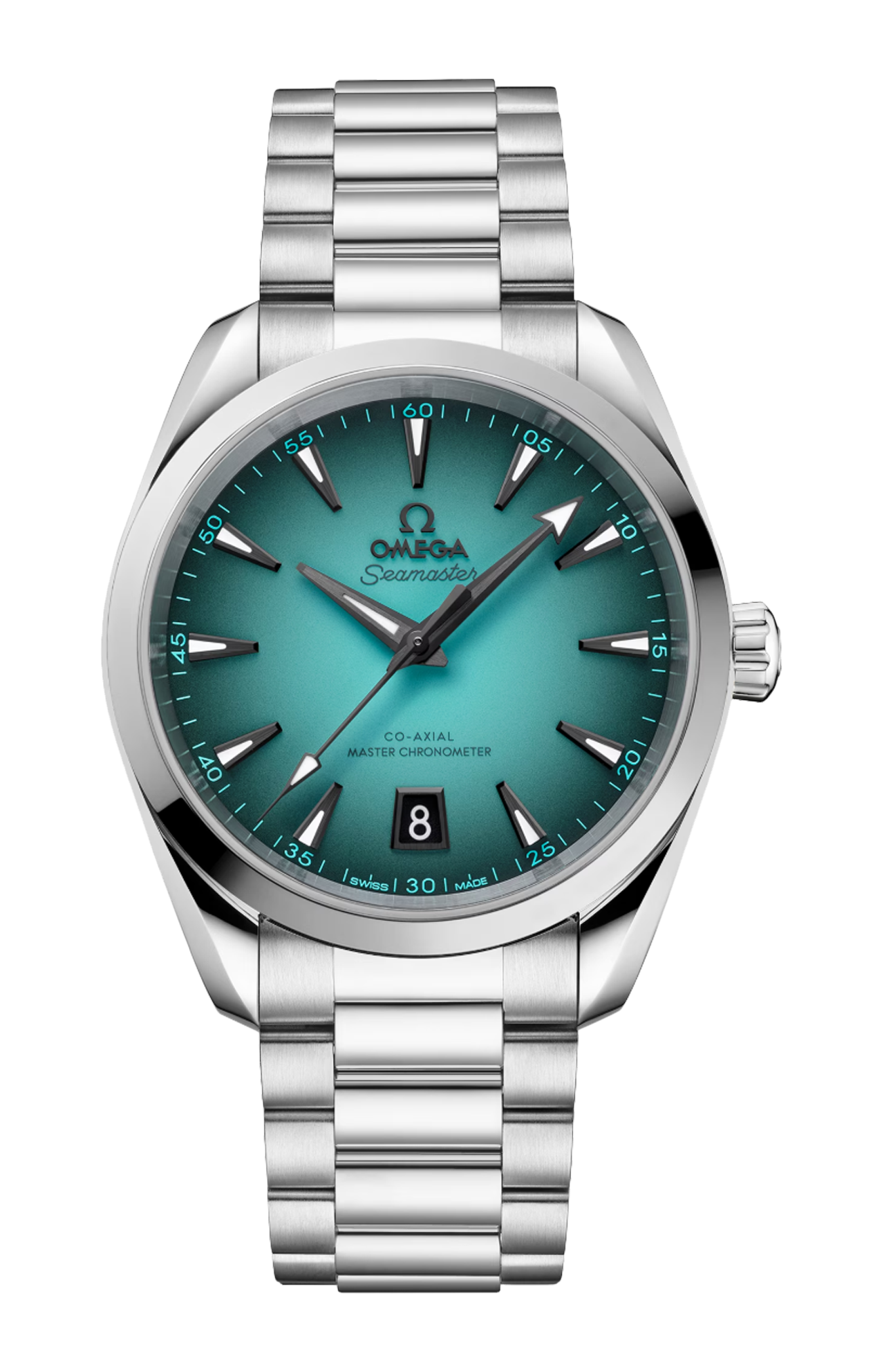 Il quadrante laccato turchese è accentuato da un effetto sfumato nero e presenta lancette sfaccettate e indici delle ore trattati in PVD grigio con Super-Luminova bianca. Anche il logo Omega e il datario a finestrella presentano un trattamento in PVD grigio per abbinarsi alle diciture applicate in grigio e turchese.