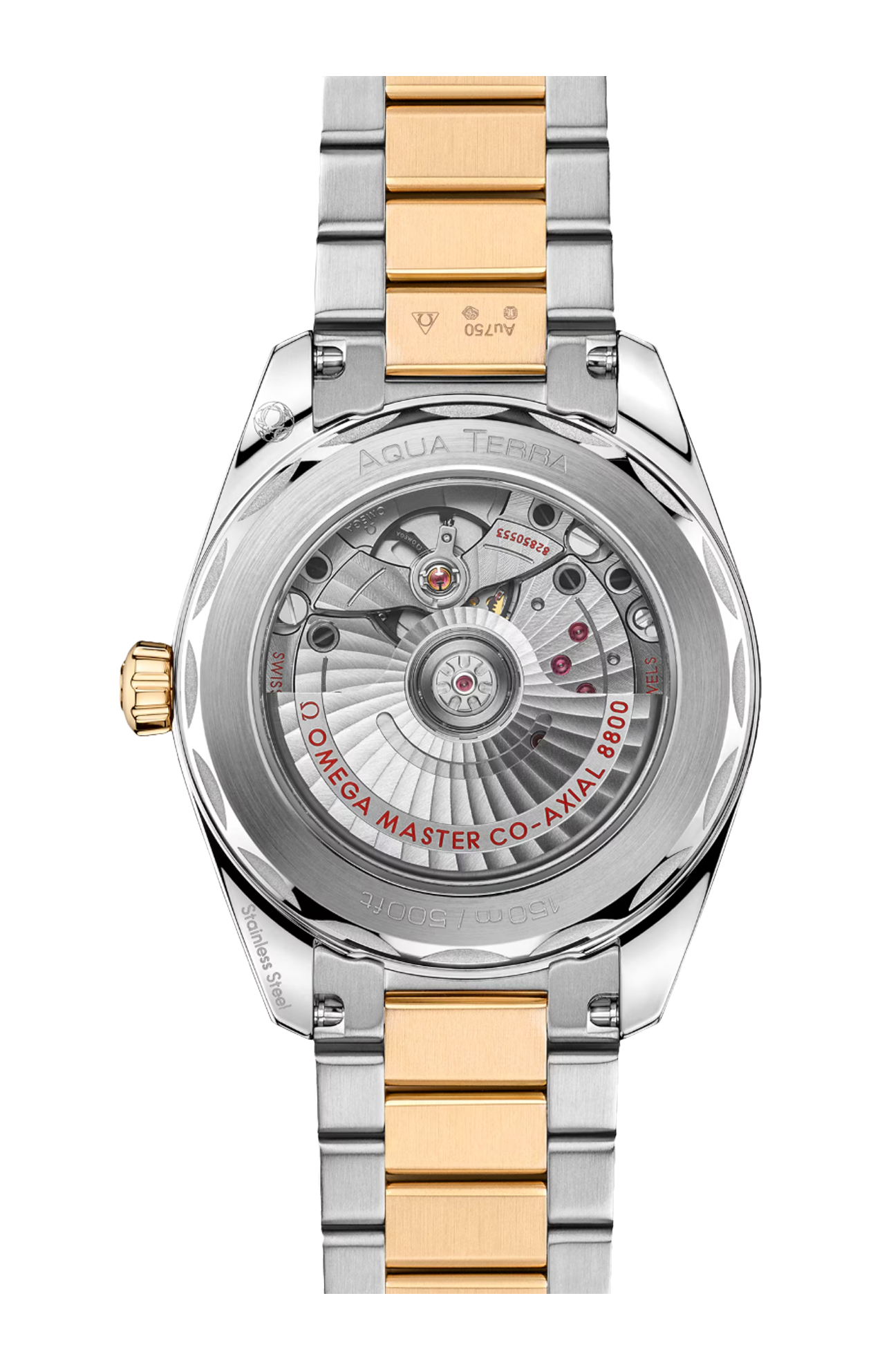 Il Seamaster Aqua Terra è un eccezionale tributo alla ricca tradizione marittima di Omega. Il modello da 38 mm presenta una cassa simmetrica in acciaio inossidabile e oro Moonshine™ 18K con fondello a vite e design con bordo ondulato.
