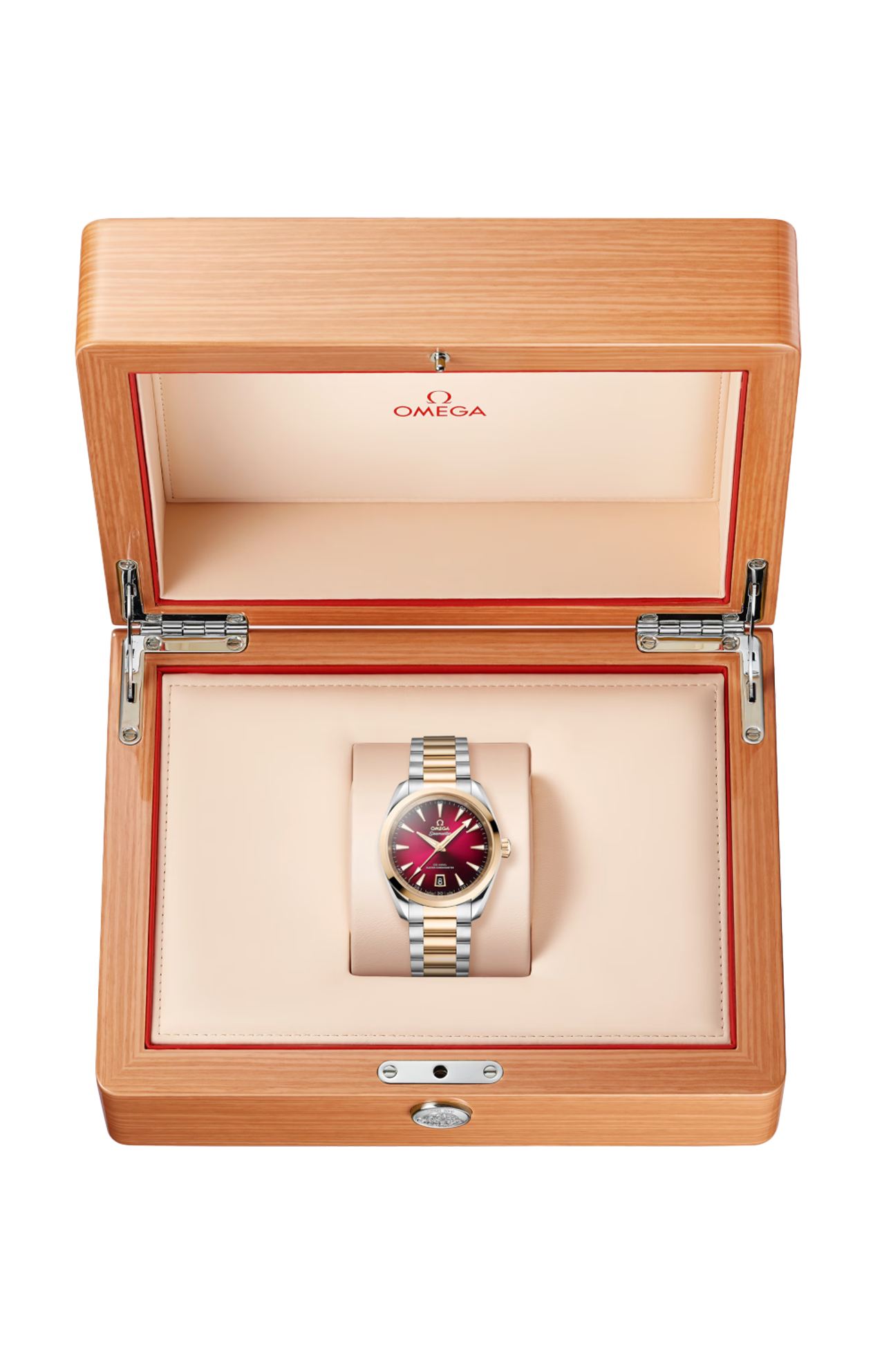 Il quadrante laccato bordeaux con finitura spazzolata ed effetto sfumato nero presenta il logo Omega in oro Moonshine™ 18K e datario a finestrella a ore 6. Le lancette e gli indici delle ore, anch’essi in oro Moonshine™ 18K, sono riempiti di Super-Luminova bianca, che emette una luminescenza blu.