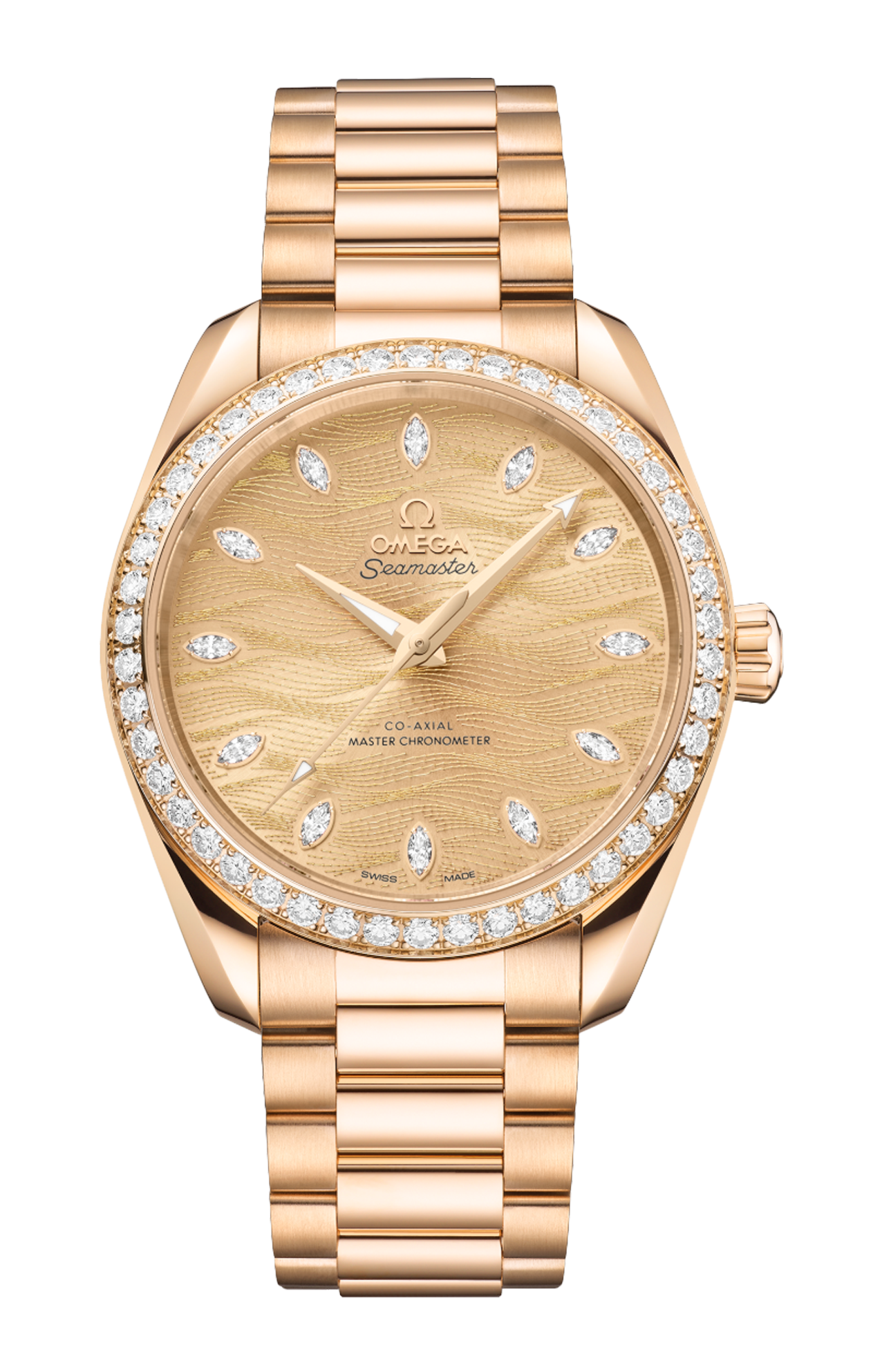 Il Seamaster Aqua Terra è un eccezionale tributo alla ricca tradizione marittima di Omega. Parte dei quattro segnatempo da 38 mm che celebrano le tonalità di stagione, questo modello presenta una cassa simmetrica in oro Moonshine™ 18K lucido, una lunetta tempestata di diamanti e un fondello caratterizzato da un design con bordo ondulato.