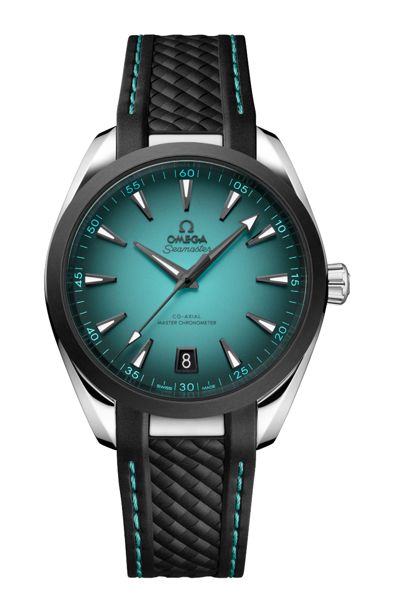 Il quadrante laccato turchese si distingue per l’incantevole colore, ispirato all’oceano e accentuato da un effetto sfumato nero; presenta inoltre lancette e indici sfaccettati trattati in PVD grigio e Super-Luminova bianca. Anche il logo Omega e il datario a finestrella sono trattati in PVD grigio, per abbinarsi alle diciture applicate in grigio, mentre la minuteria esterna è proposta in turchese.
