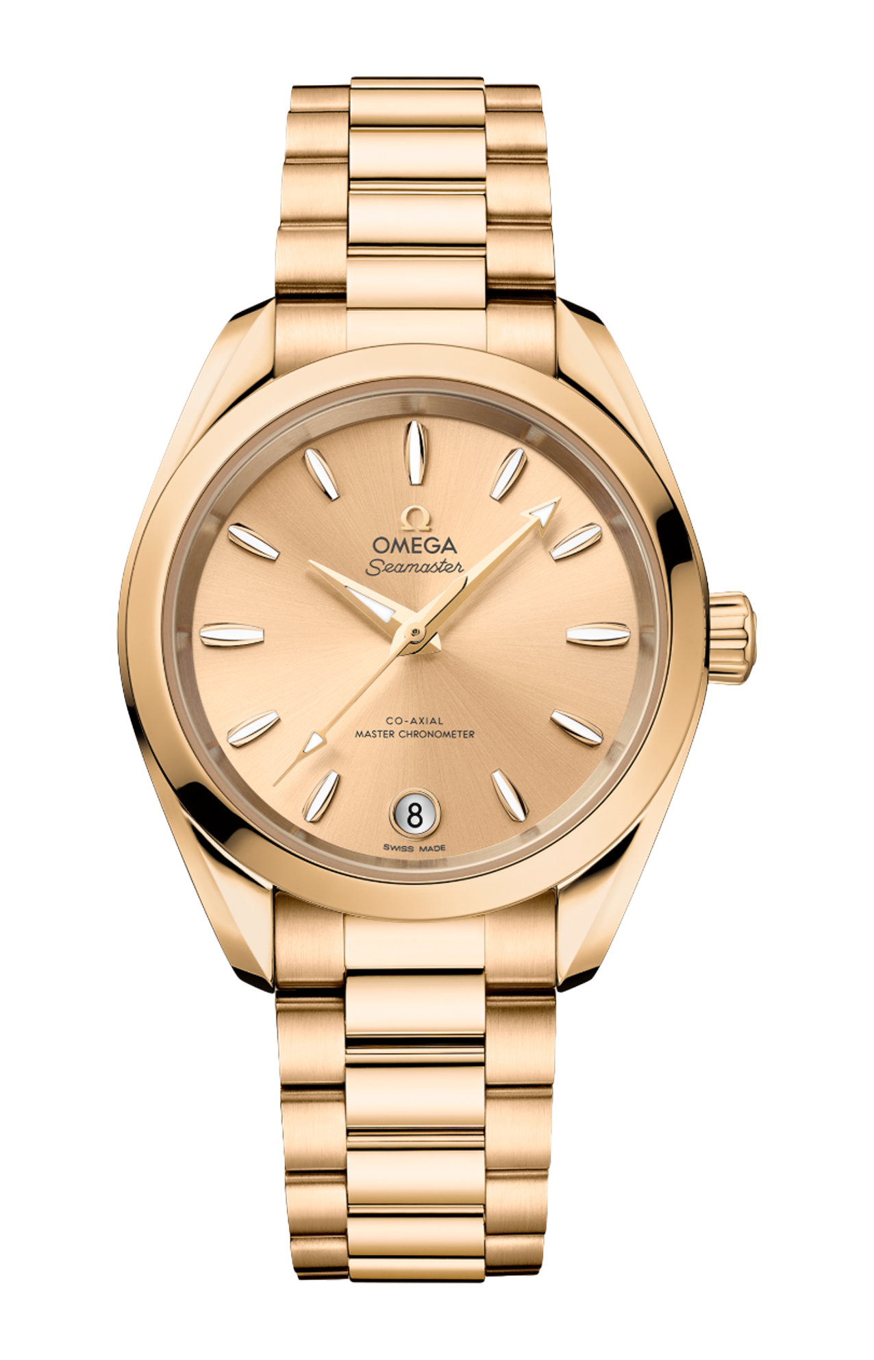 Il Seamaster Aqua Terra è un eccezionale tributo alla ricca tradizione marittima di Omega. Il modello da 34 mm presenta una cassa simmetrica in oro Moonshine™ 18K con fondello a vite e design con bordo ondulato.
