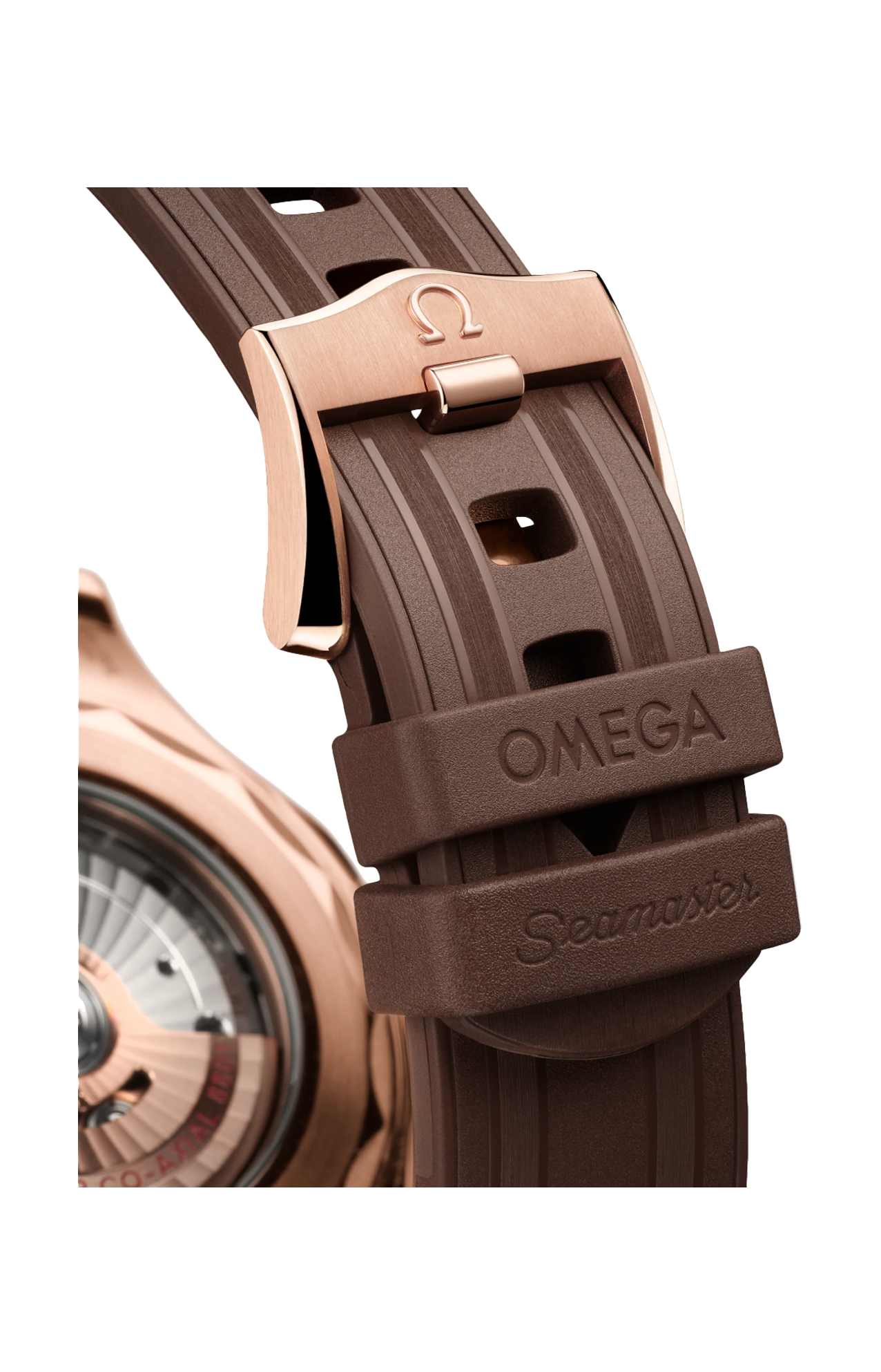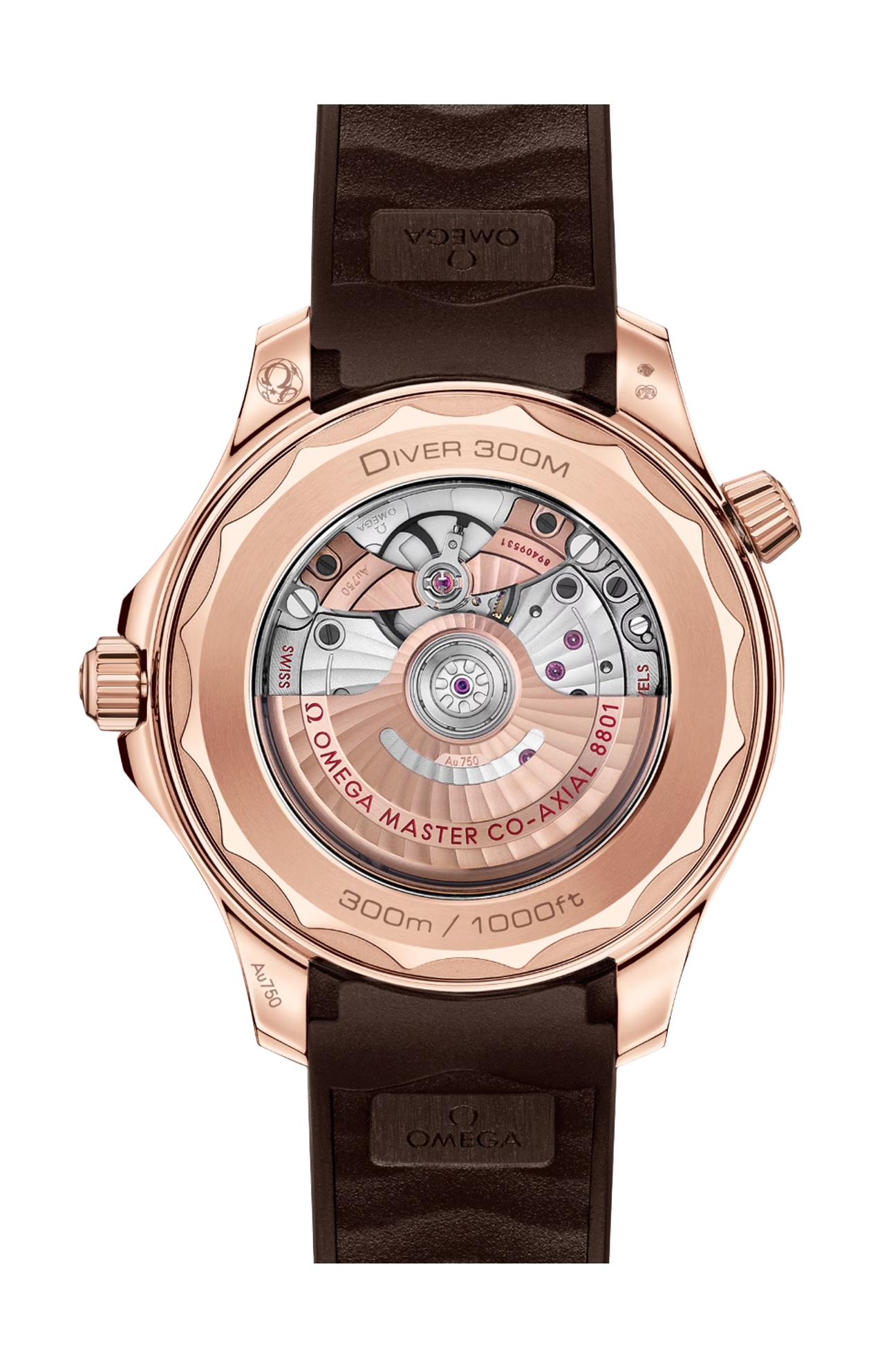 Corredato da un cinturino in caucciù marrone, l’orologio è animato dal calibro Omega Master Chronometer 8801, visibile attraverso il fondello in vetro zaffiro con bordo ondulato.