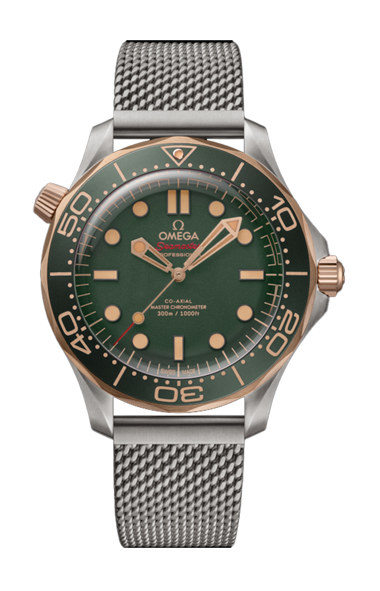 Questo modello da 42 mm è realizzato in titanio grado 2 e nell’esclusivo Bronze Gold di OMEGA. Include una lunetta con anello in alluminio anodizzato verde e scala graduata vintage in Super-Luminova.