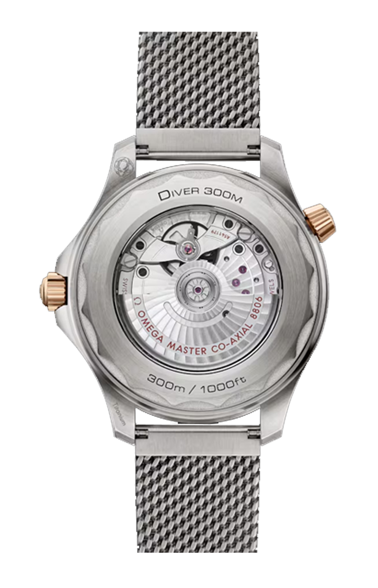 Corredato da un bracciale a maglia milanese spazzolato con fibbia, l’orologio è animato dal calibro OMEGA Co-Axial Master Chronometer 8806, visibile attraverso il fondello in vetro zaffiro con bordo ondulato.
