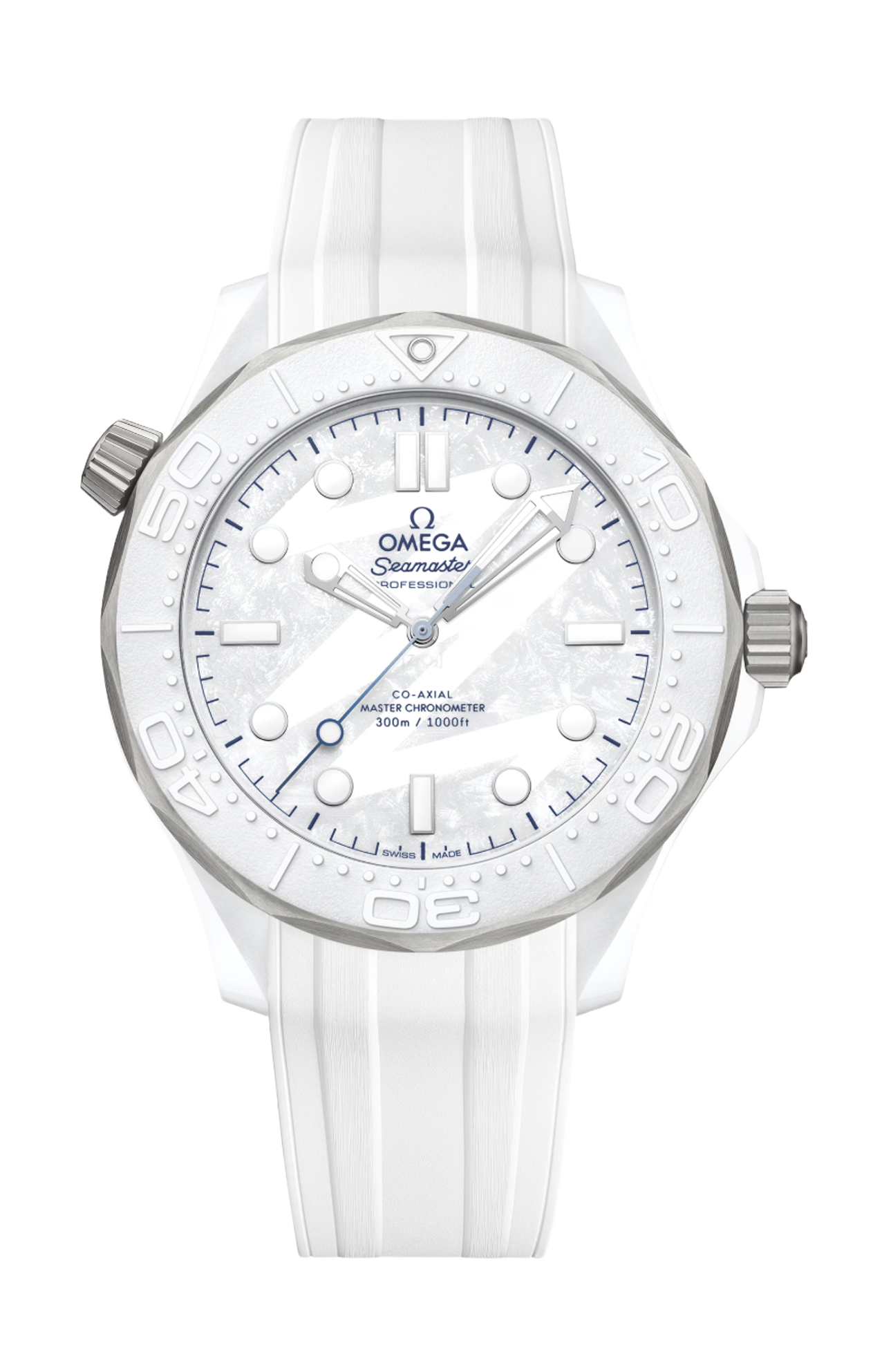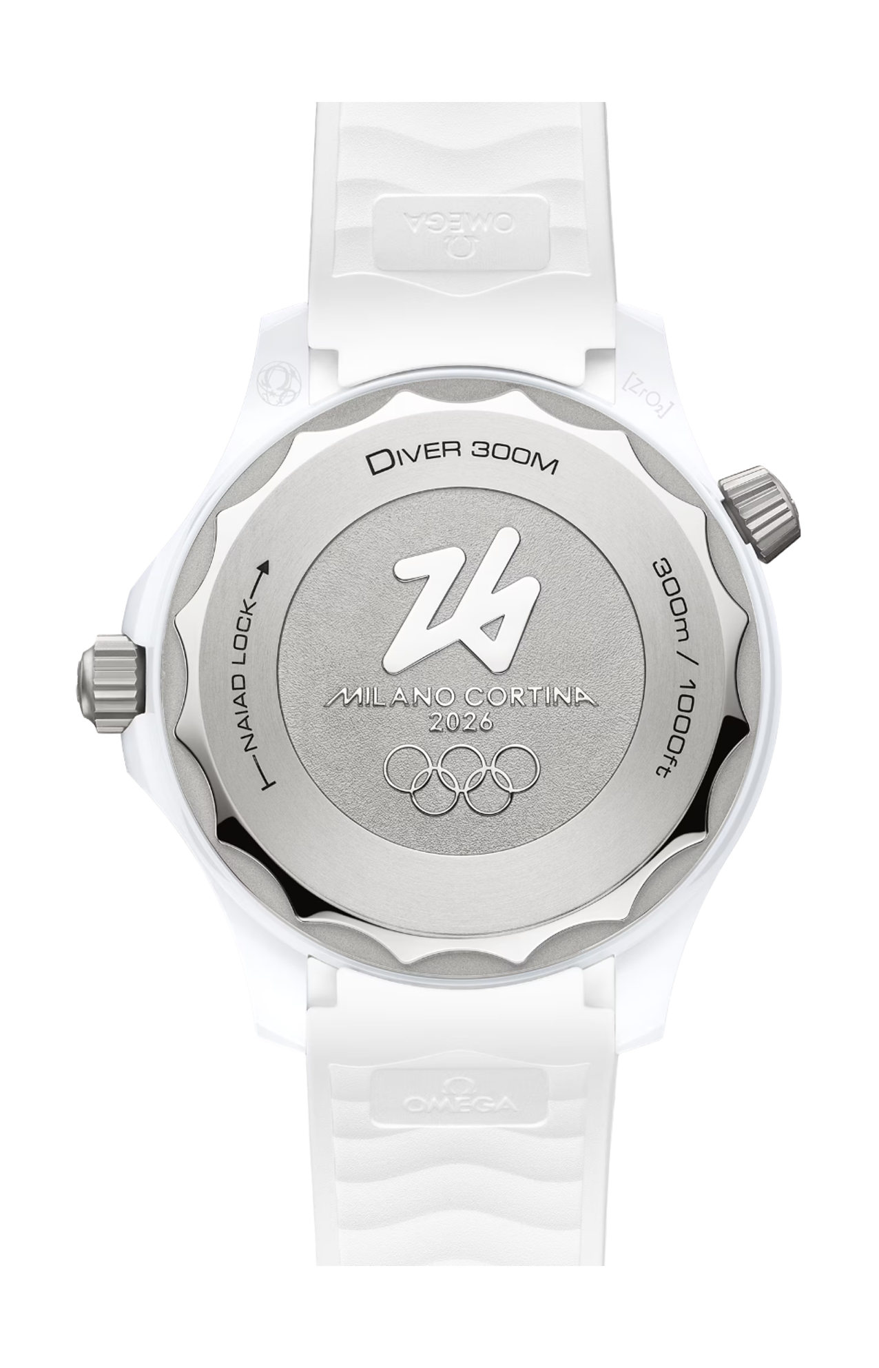 Racchiuso in uno speciale cofanetto di presentazione, l’orologio da 43,5 mm è realizzato in ceramica bianca e titanio grado 5. L’anello della lunetta in ceramica bianca rivela una scala d’immersione lavorata con ablazione al laser in rilievo positivo. Per creare un look invernale, il quadrante in ceramica bianca presenta un dettaglio applicato effetto ghiaccio inciso al laser, disegnato con un unico tratto continuo come se tracciato con un dito su un vetro appannato o sulla neve, richiamo al numero “26” del logo di Milano Cortina 2026. A completare il design del quadrante, le lancette e gli indici rodiati sono riempiti di Super-LumiNova bianca, mentre la lancetta dei secondi centrale presenta una delicata sfumatura blu.