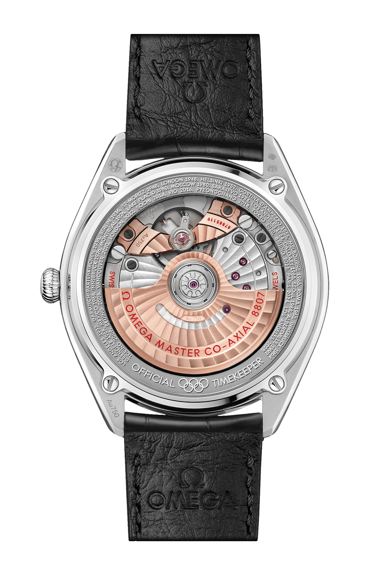 Sul fondello è presente un anello in Canopus Gold™ 18K con tutte le città e le date in cui si sono svolti i Giochi Olimpici cronometati da Omega: da Los Angeles 1932 a Los Angeles 2028.
