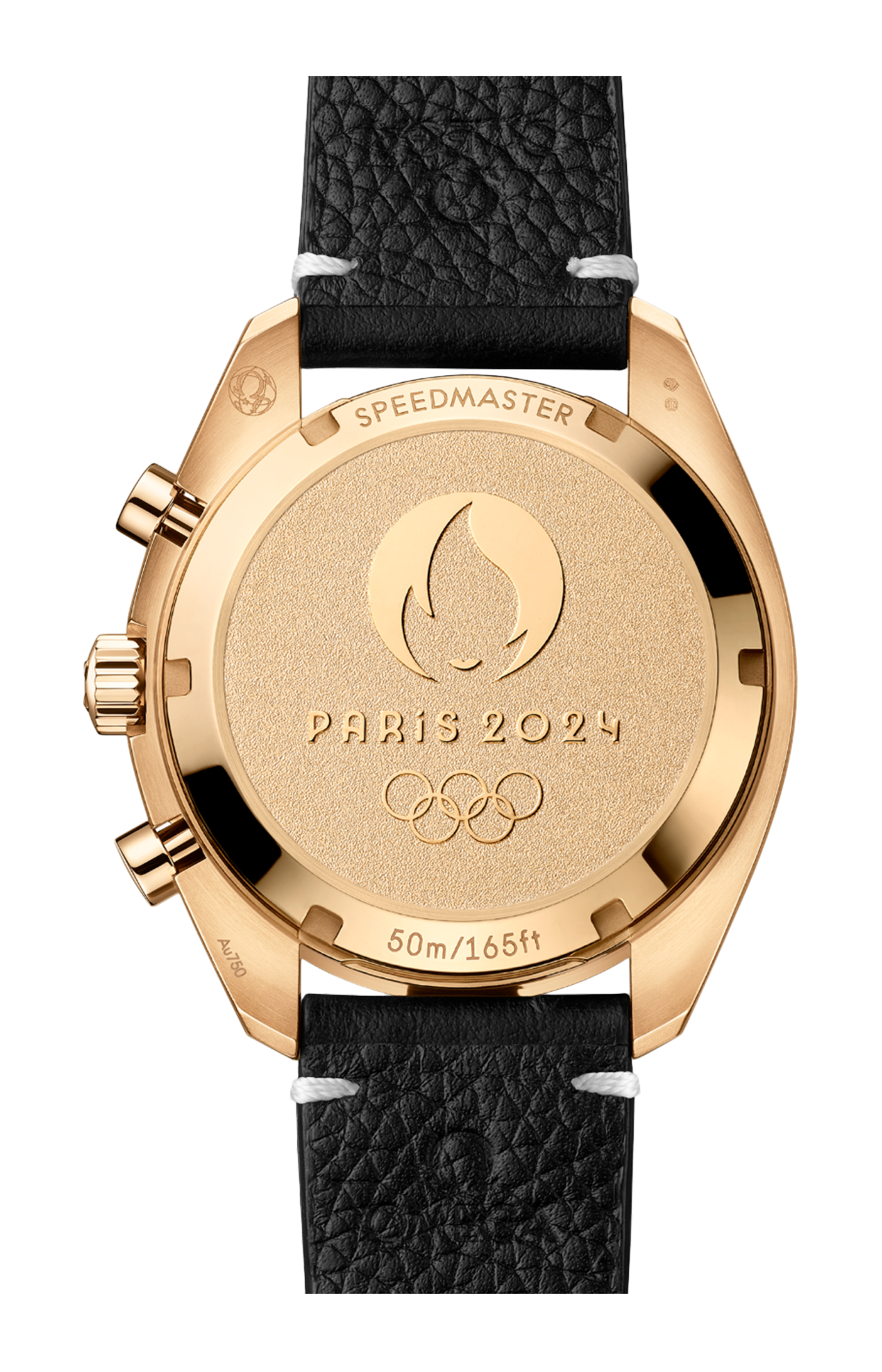 Sul retro, il fondello commemorativo in oro Moonshine™ 18K rivela un medaglione stampato con base smerigliata e logo di Parigi 2024 lucidato a specchio, con la scritta “Paris 2024” e i cerchi olimpici.