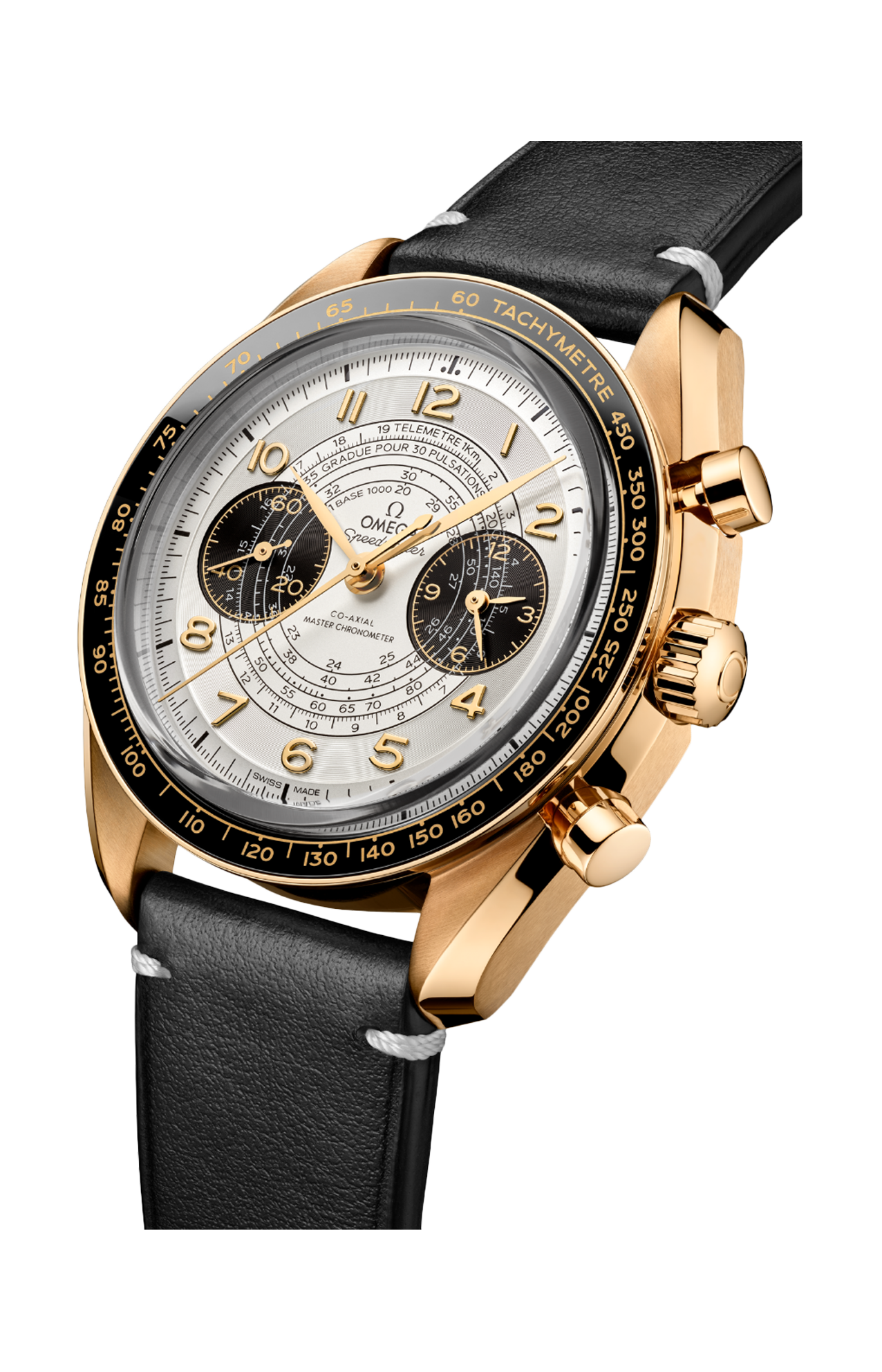Questo modello da 43 mm è un omaggio alle Olimpiadi di Parigi 2024 e sfoggia i tre colori principali dell’evento: oro, nero e bianco. L’orologio è realizzato in oro Moonshine™ 18K e presenta un quadrante bianco argentato opalino con contatori bruniti. Tra le caratteristiche aggiuntive si annoverano l’anello della lunetta in ceramica nera con scala tachimetrica in Ceragold™ Omega, i numeri arabi in oro Moonshine™ 18K e le lancette a foglia e dei contatori con trattamento in PVD oro Moonshine™.