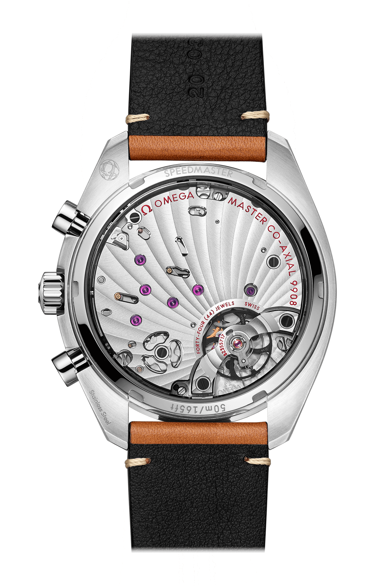 Corredato da un cinturino in pelle marrone vintage, l’orologio presenta un contatore dei piccoli secondi argentati a ore 9 e due contatori 12 ore e 60 minuti argentati posizionati a ore 3. Il segnatempo è animato dal calibro Omega Co-Axial Master Chronometer 9908.