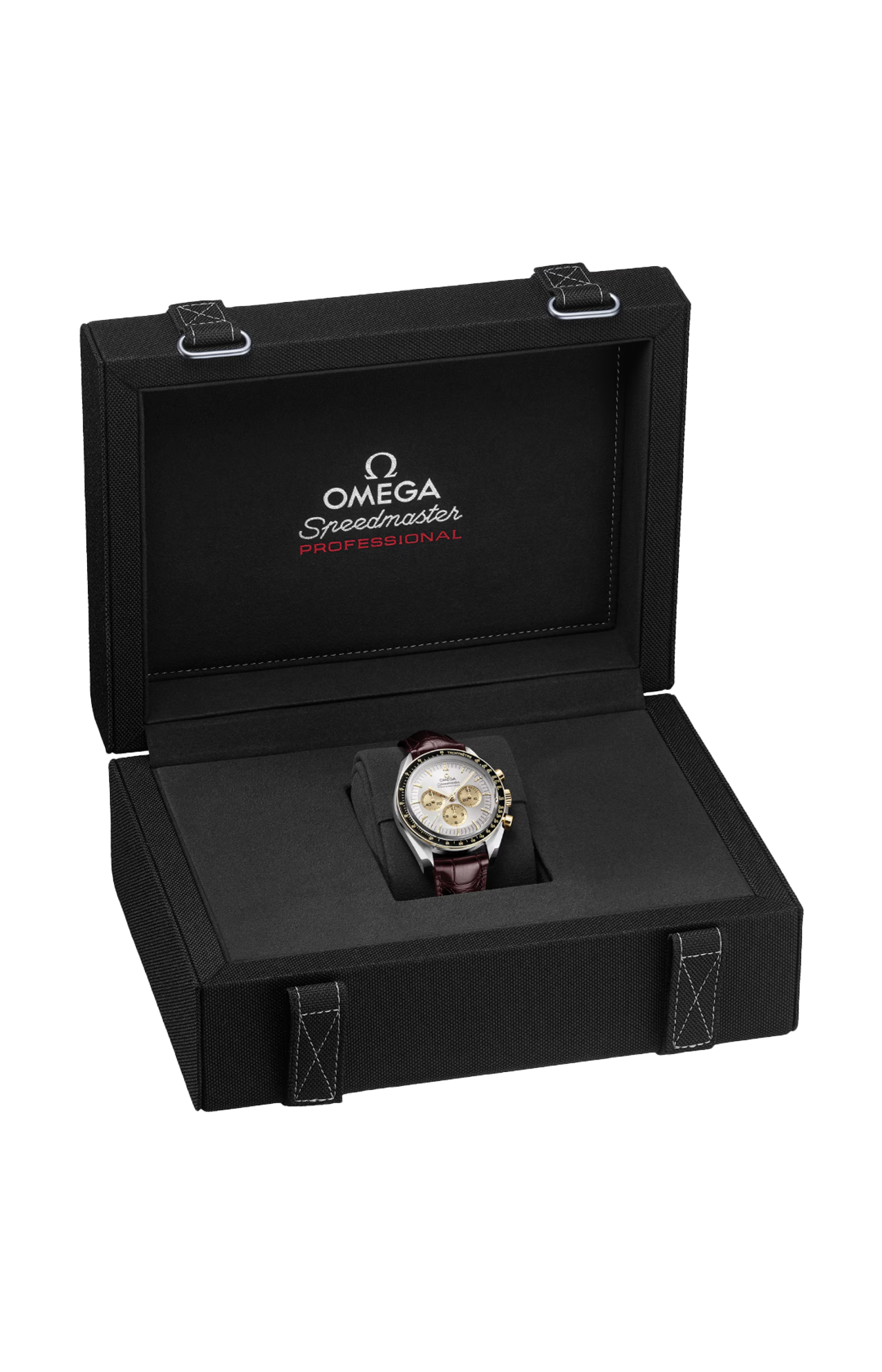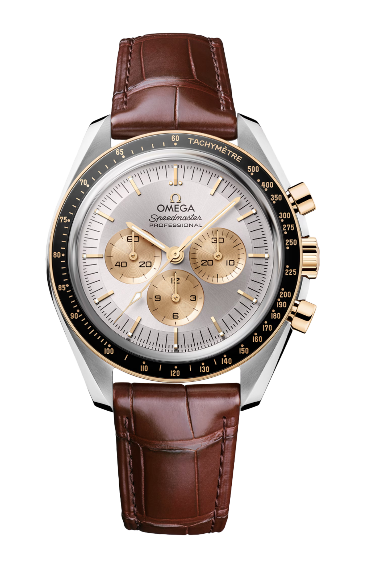 Il quadrante “Step” bianco argentato con finitura spazzolata presenta indici e logo Omega applicati, lancette in oro Moonshine™ 18K e contatori dei piccoli secondi, dei 30 minuti e delle 12 ore in oro Moonshine™ 18K con trattamento galvanico.
