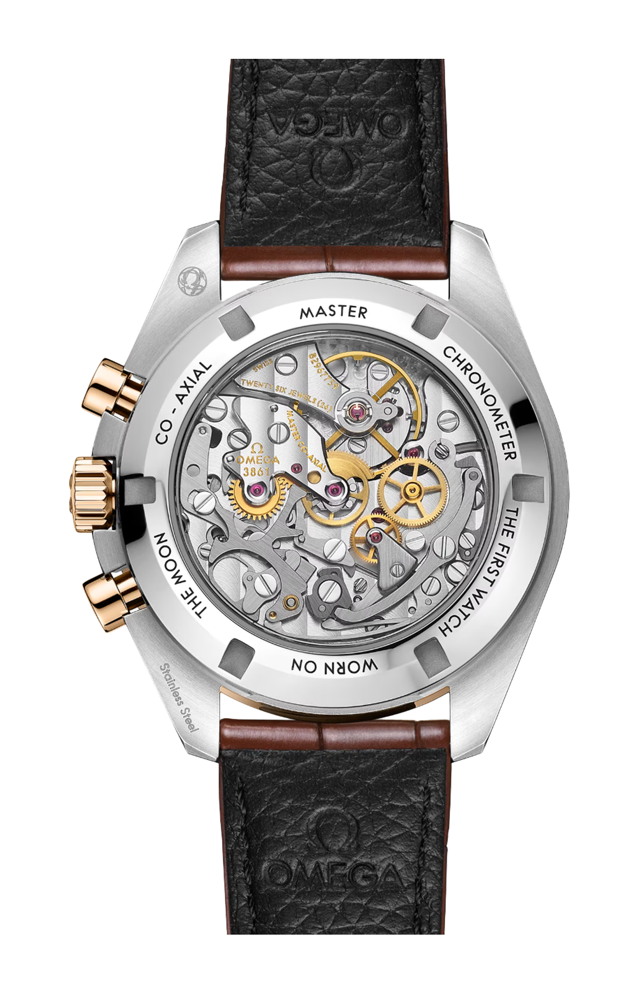 L’orologio è dotato di un cinturino in pelle di alligatore marrone e animato dal calibro Omega Co-Axial Master Chronometer 3861.