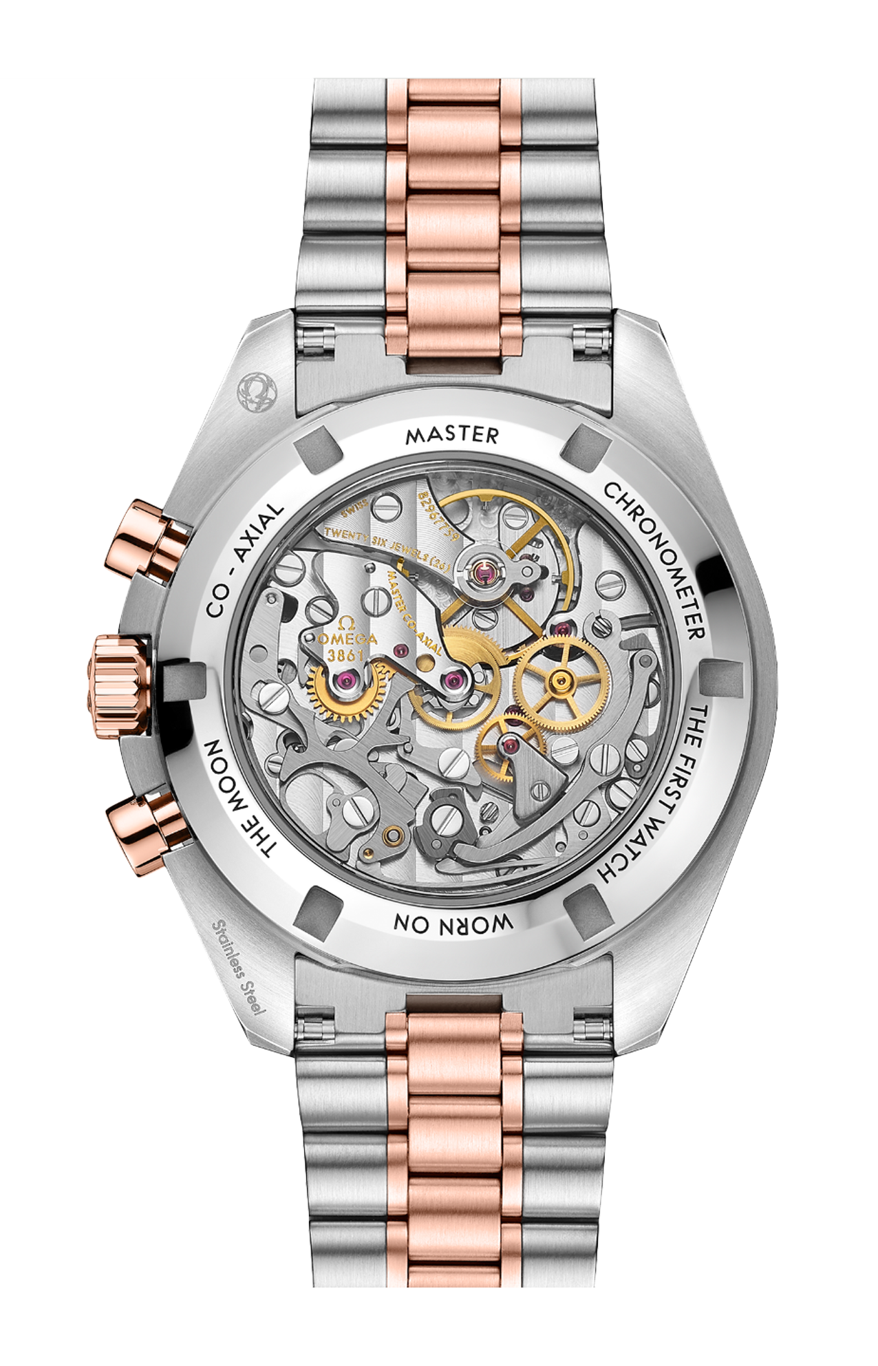 Questo modello bicolore da 42 mm in acciaio inossidabile e oro Sedna™ 18K presenta quadrante e fondello in vetro zaffiro. Ispirato alla quarta generazione di Speedmaster indossata sulla Luna, sfoggia una cassa asimmetrica con anello della lunetta in ceramica nera e il celebre “Dot over 90” in Ceragold™ Omega sulla scala tachimetrica.