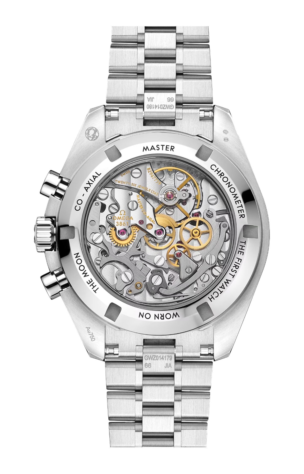 L'orologio è animato dal calibro Omega Co-Axial Master Chronometer 3861, che alimenta il contatore dei piccoli secondi, i contatori dei 30 minuti e delle 12 ore e la lancetta cronografica centrale.