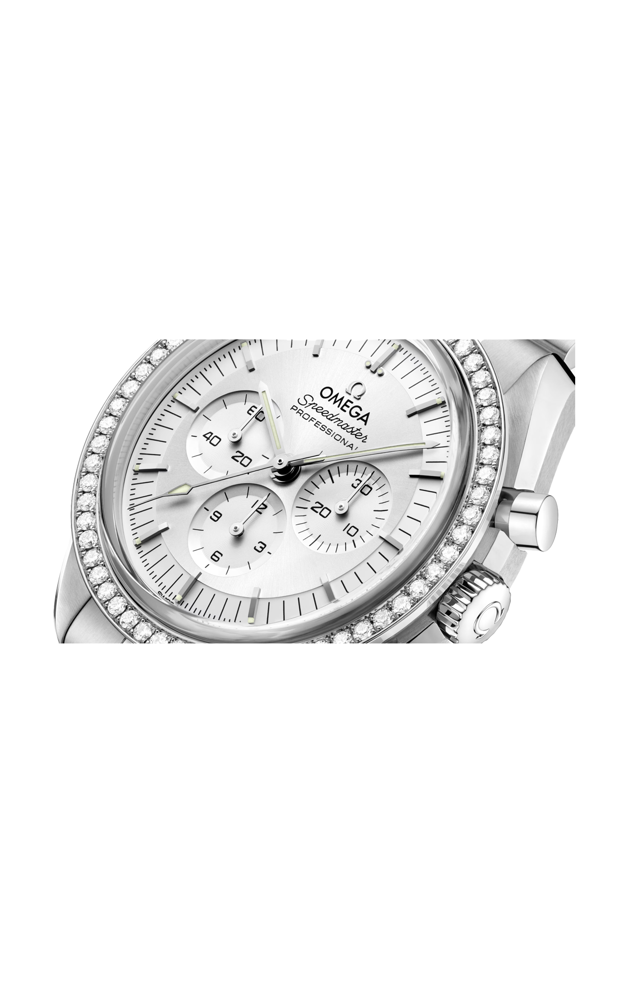 Corredato da un bracciale a 5 maglie incurvate per fila, questo Moonwatch da 42 mm in oro Canopus Gold™ 18K presenta quadrante e fondello in vetro zaffiro. Ispirato allo Speedmaster di quarta generazione indossato sulla Luna, si caratterizza per la cassa asimmetrica con quadrante argentato con finitura spazzolata e la lunetta tempestata di diamanti.