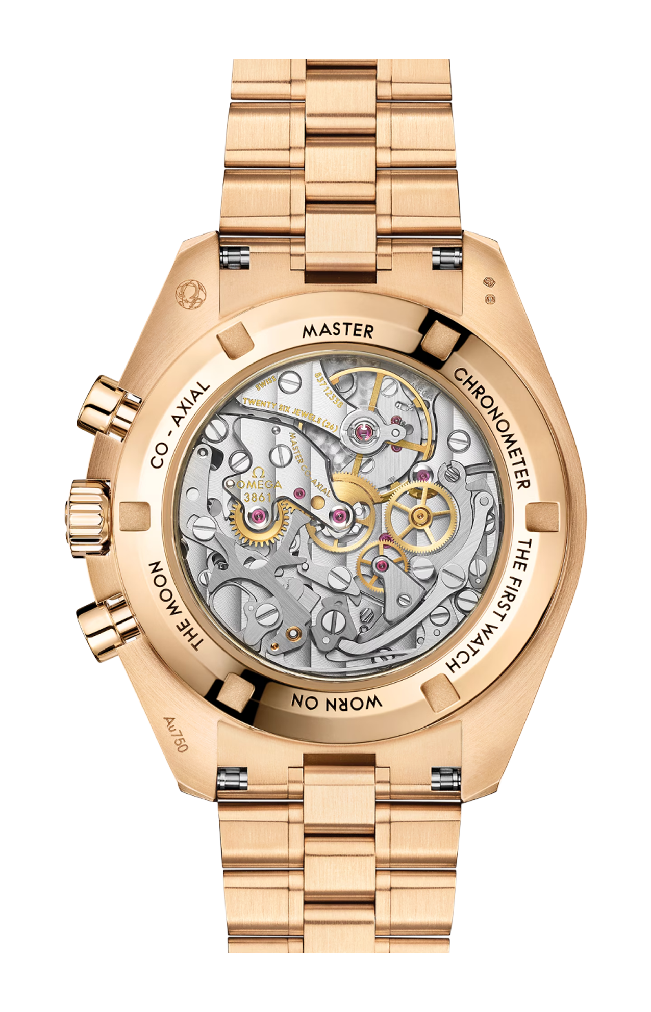 L'orologio è animato dal calibro OMEGA Co-Axial Master Chronometer 3861, che alimenta il contatore dei piccoli secondi, dei 30 minuti e delle 12 ore, insieme alla lancetta cronografica centrale.
