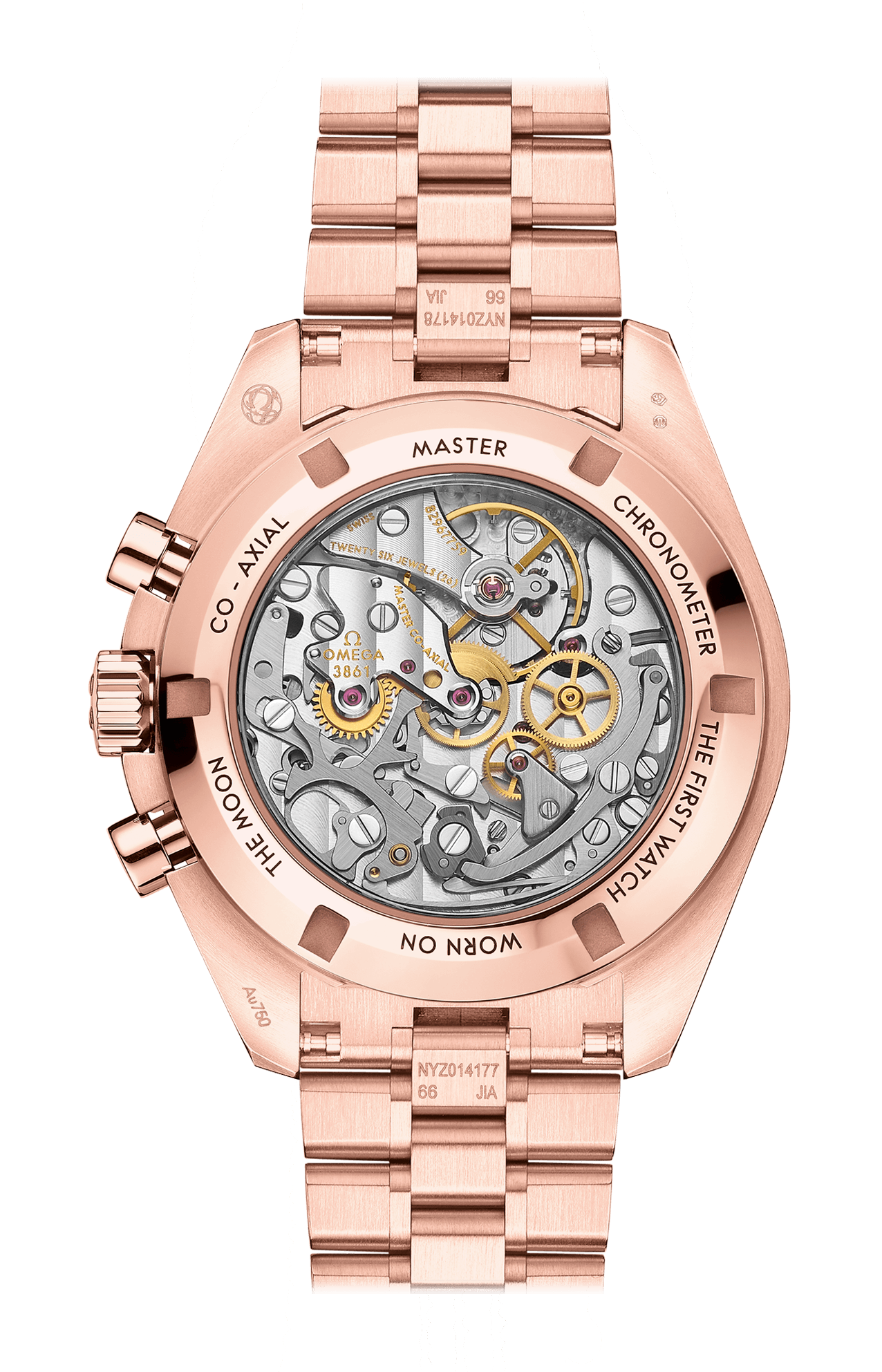 Il segnatempo è animato dal calibro Omega Co-Axial Master Chronometer 3861, che alimenta il contatore dei piccoli secondi, i contatori dei 30 minuti e delle 12 ore e la lancetta cronografica centrale.