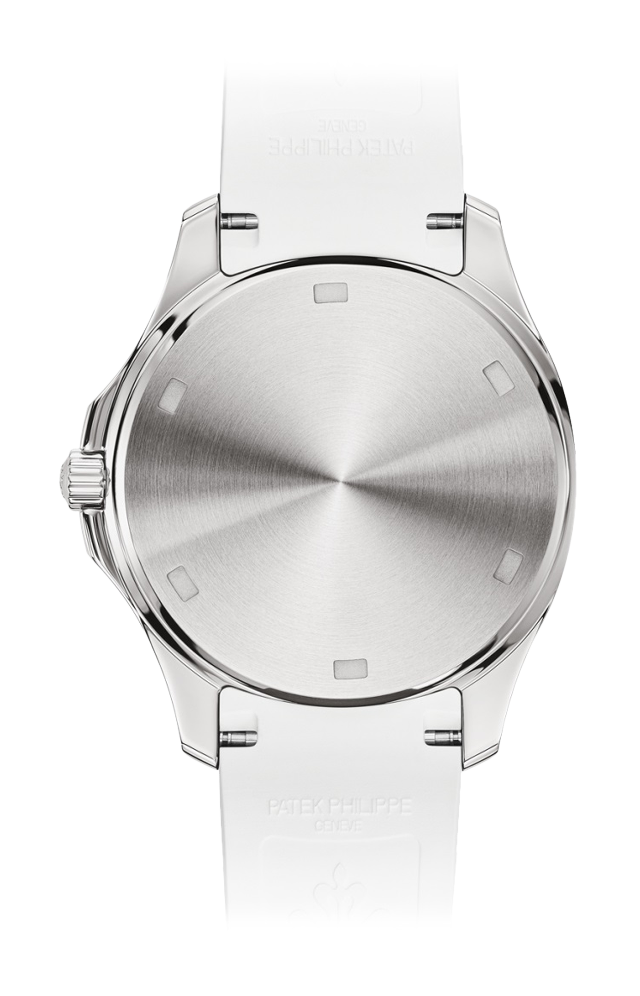 Patek Philippe reinterpreta l’Aquanaut luce al quarzo in acciaio dotandolo di un diametro superiore (38,8 mm) e di un nuovo cinturino in materiale composito integrato. Questo modello di punta dello sport chic contemporaneo si presenta con quadrante e cinturino abbinati, di un elegante bianco opaco. La cassa ottagonale arrotondata, impermeabile fino a 30 m, è sublimata da finiture satinate e lucide. La lunetta è illuminata dal bagliore di 48 diamanti (~1,11 ct). Il fermaglio déployant brevettato è reso sicuro da quattro punti di attacco indipendenti.
