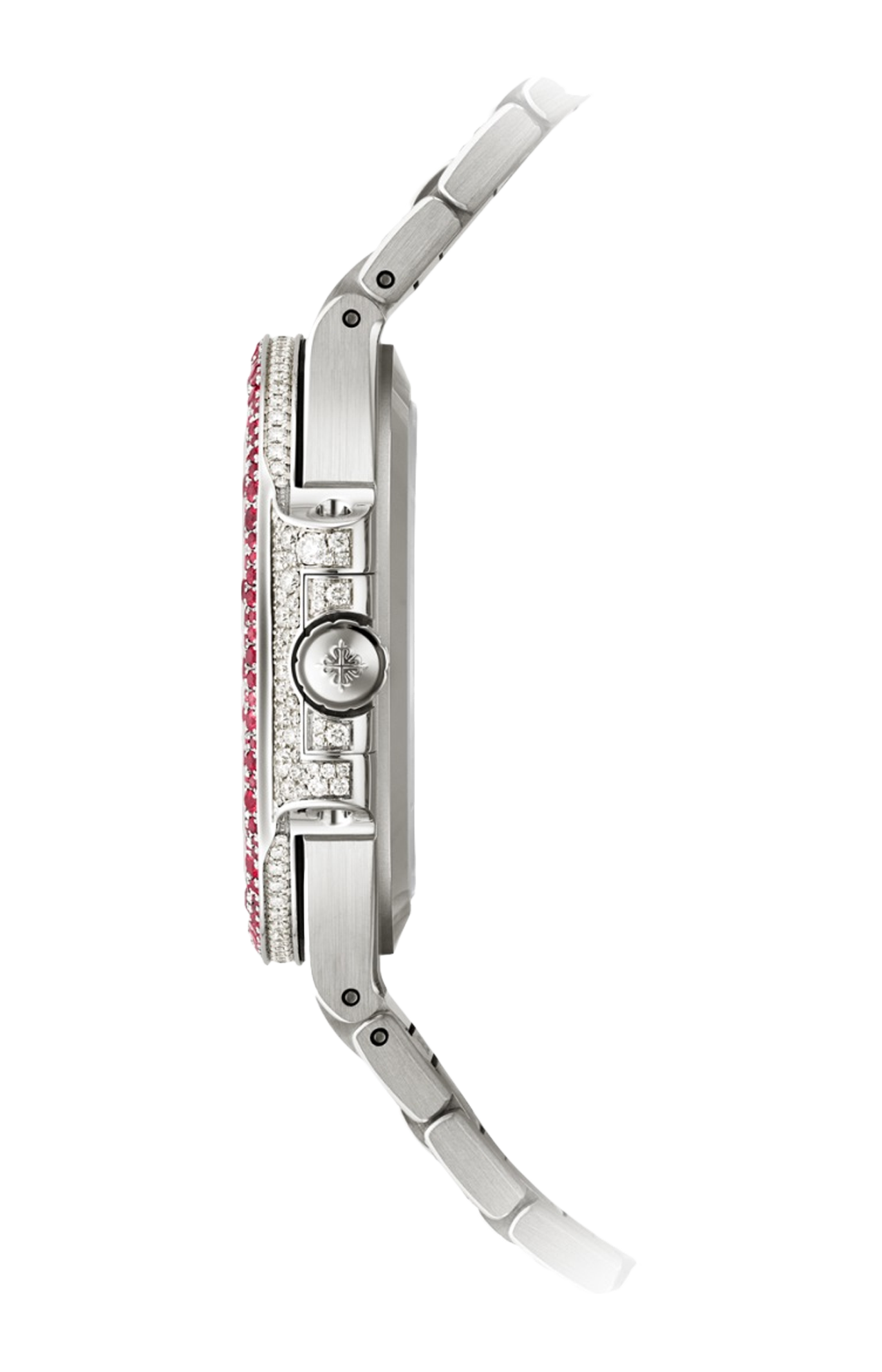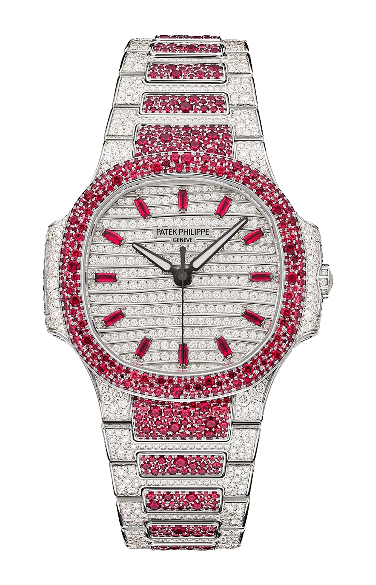 Patek Philippe dispiega tutta la propria sapiente arte di incastonatura in un nuovo Nautilus Haute Joallerie da donna in oro bianco tempestato di 1500 diamanti taglio brillante (6,53 ct) e 876 rubini (6,58 ct). Per conferire a questa preziosa parure una brillantezza senza pari, la manifattura ha scelto di affidarsi alla sofisticatissima tecnica di incastonatura “effetto neve”. Il quadrante in oro bianco non passa inosservato grazie alle sue file di diamanti taglio brillante disposte secondo il tipico motivo a piccole onde della collezione Nautilus da donna. Il calibro 26-330 S a carica automatica è visibile attraverso il fondo in cristallo di zaffiro trasparente. Il bracciale è dotato di un fermaglio déployant brevettato Patek Philippe, reso sicuro da quattro punti di attacco indipendenti.