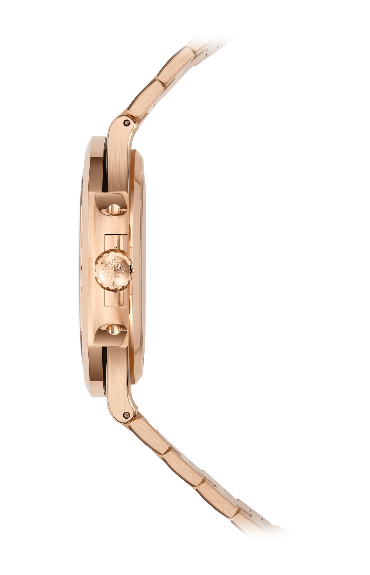 Cassa, lunetta e bracciale in oro rosa, impreziositi da finiture lucide e satinate a contrasto.
