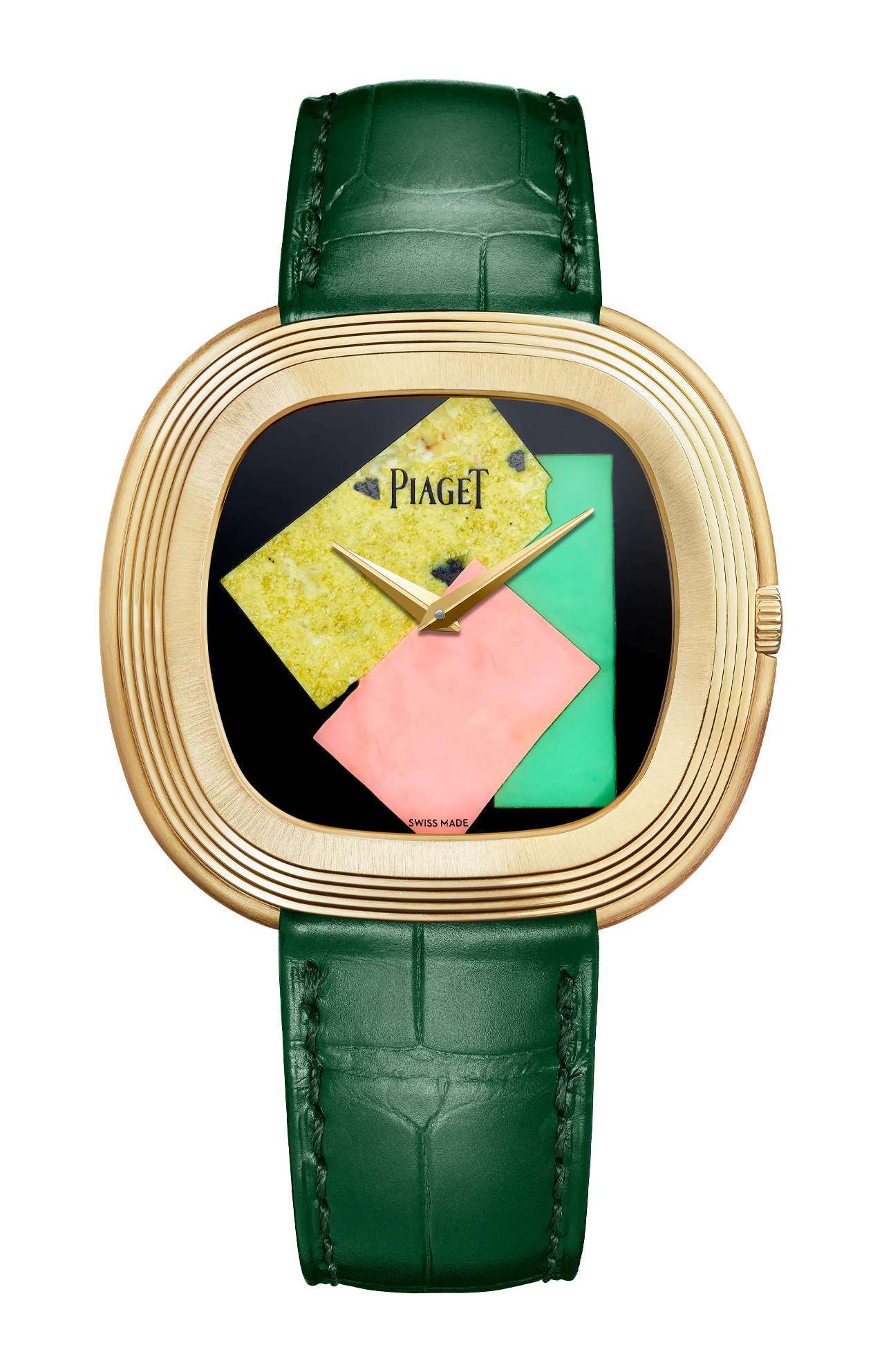 Orologio Andy Warhol, 45 x 43 mm. Cassa in oro giallo 18 carati. Quadrante in onice con serpentino giallo, opale rosa e crisoprasio verde. Cinturino in pelle di alligatore verde. Movimento meccanico automatico di manifattura 501P1.