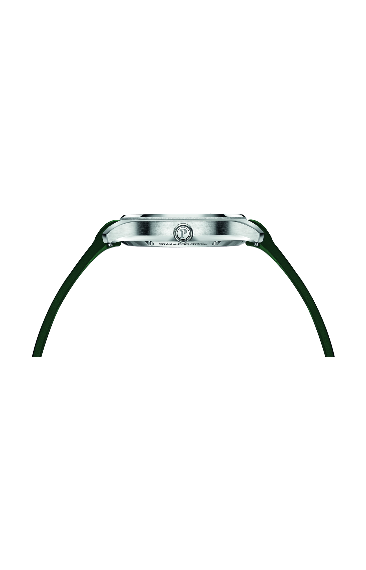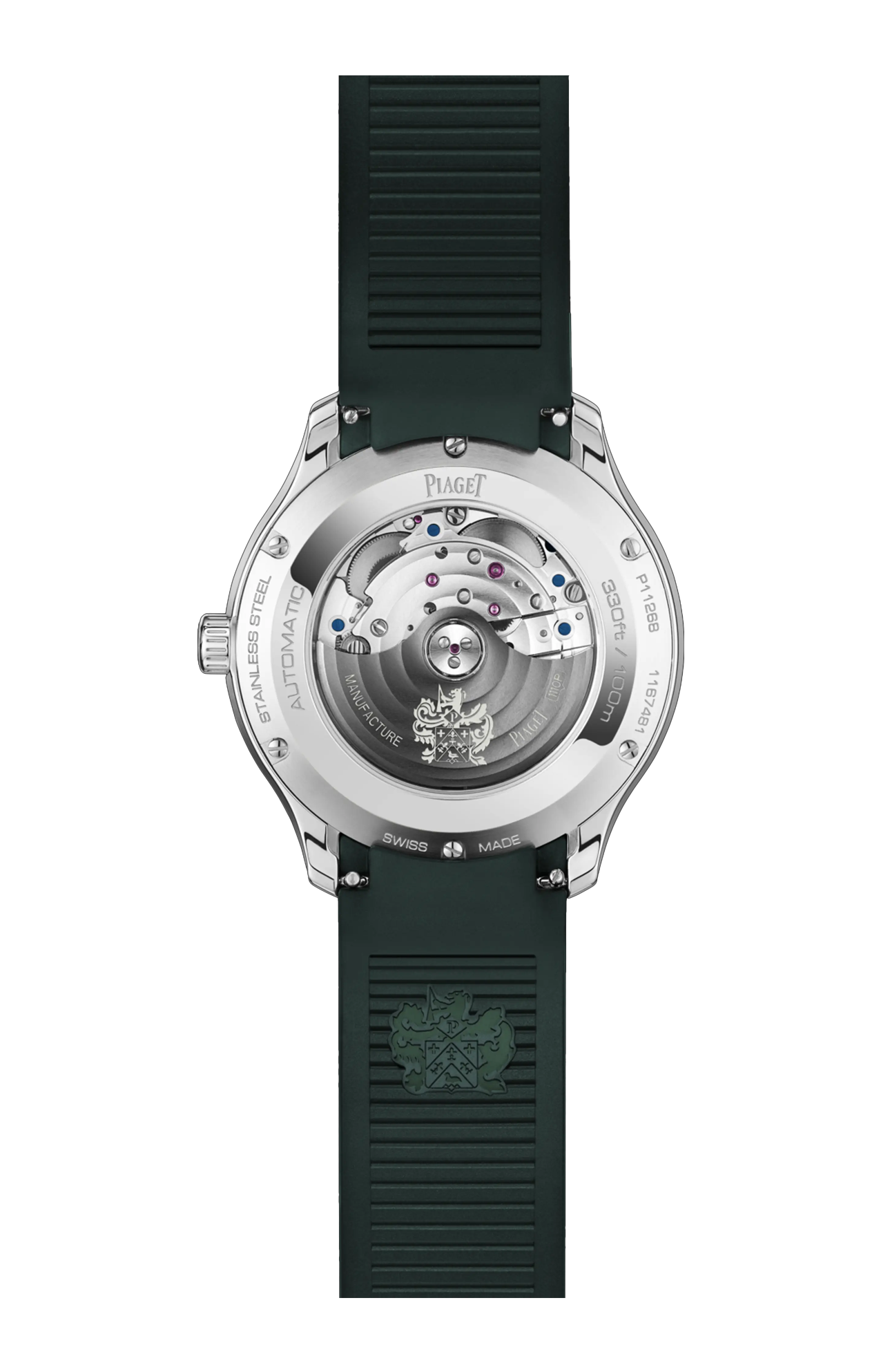 Orologio Piaget Polo Field, 42 mm. Cassa in acciaio. Quadrante verde con indici e lancette Superluminova®. Fondello in vetro zaffiro. Bracciale in caucciù intercambiabile. Movimento meccanico automatico di manifattura 1110P.