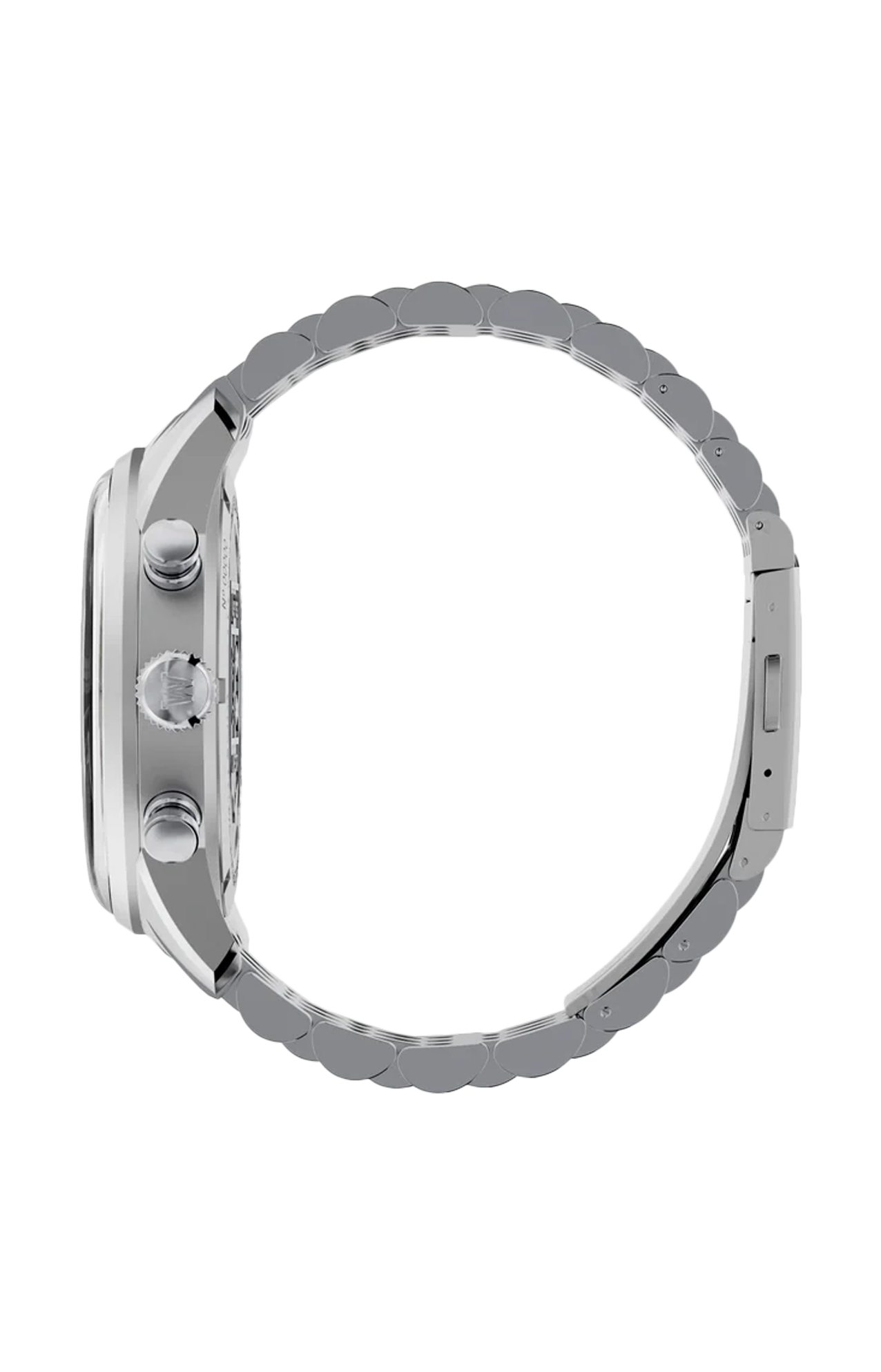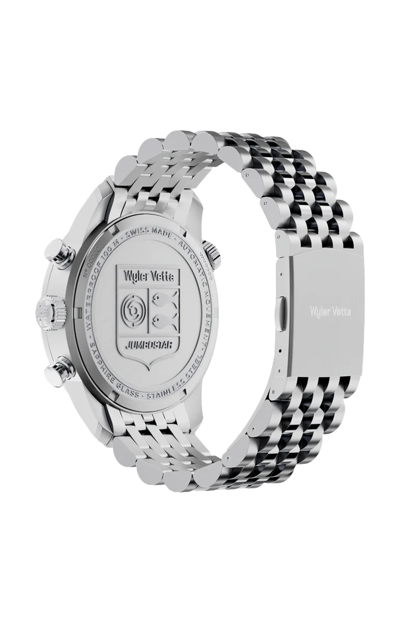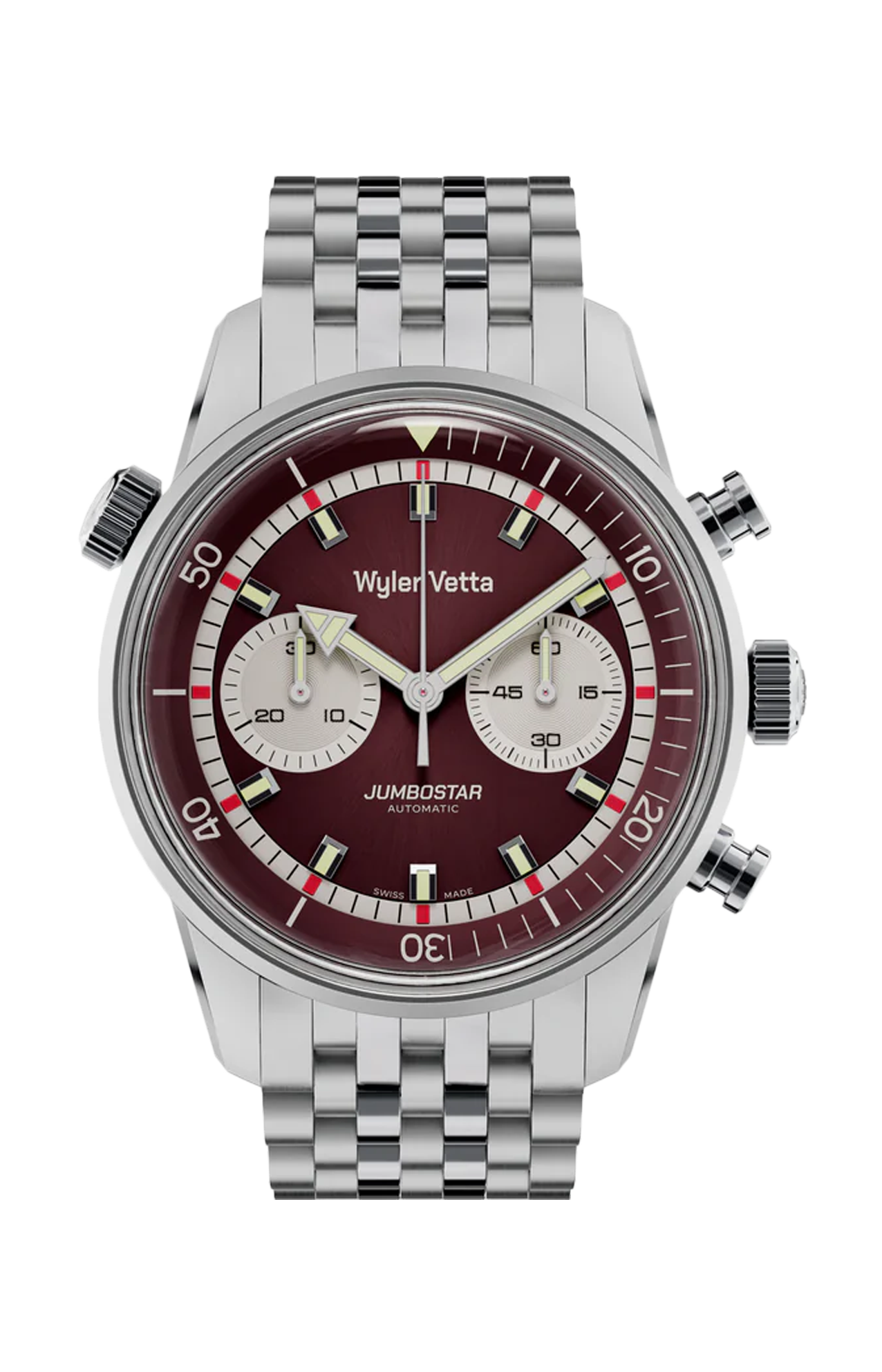 Ispirato alla versione italiana dell’iconico cronografo JUMBOSTAR del 1968, con il caratteristico ribassamento del quadrante color crema con tacche poste in corrispondenza delle ore 12 in color rosso acceso. La seconda corona, posta a ore 10, aziona la ghiera interna girevole conta minuti.