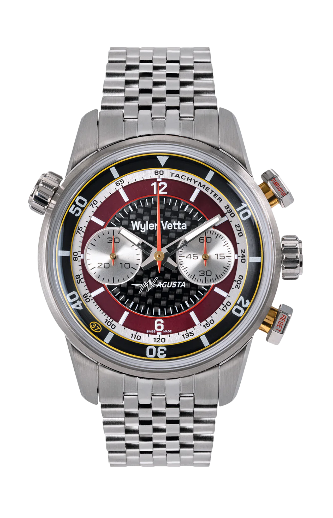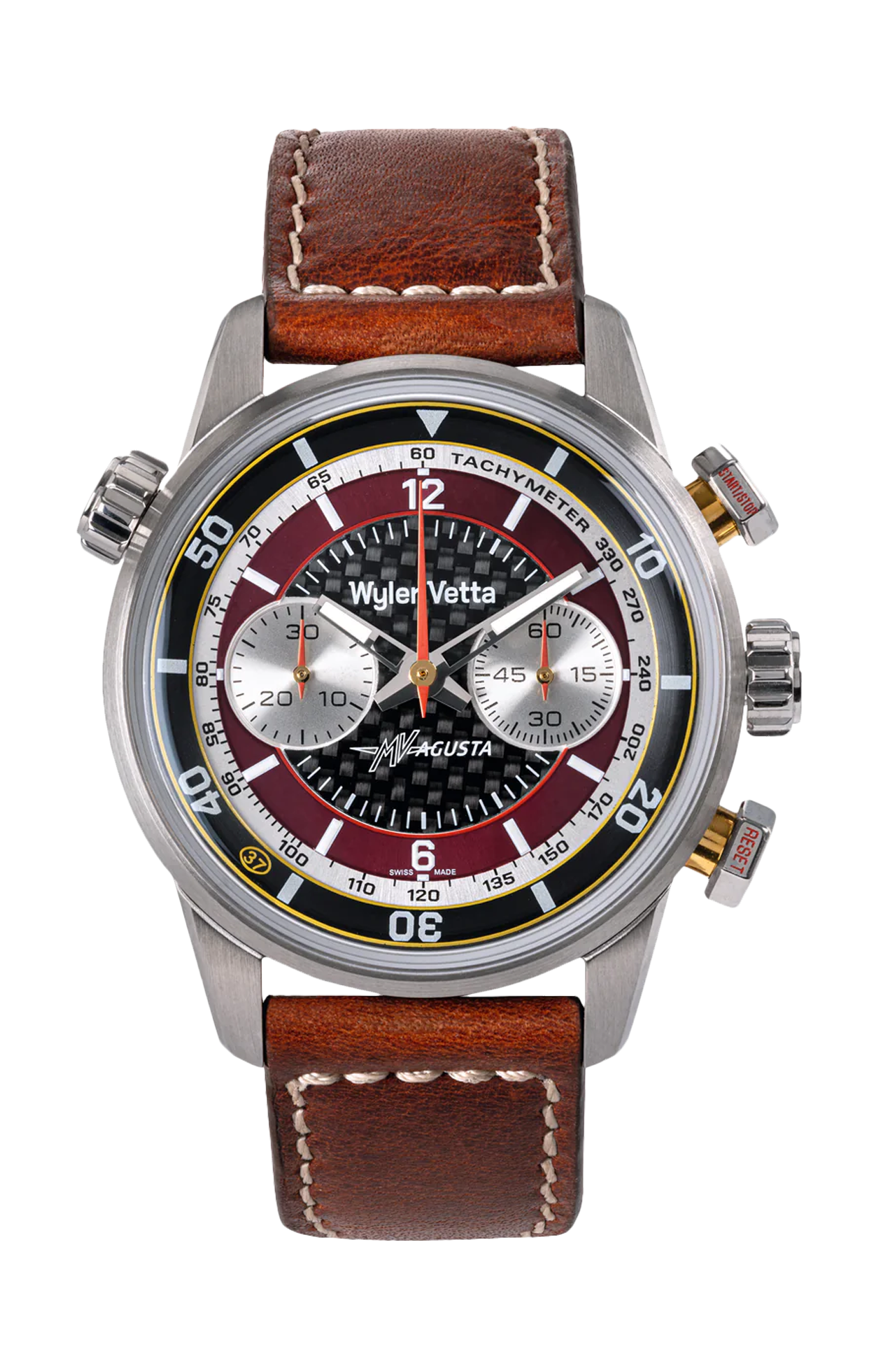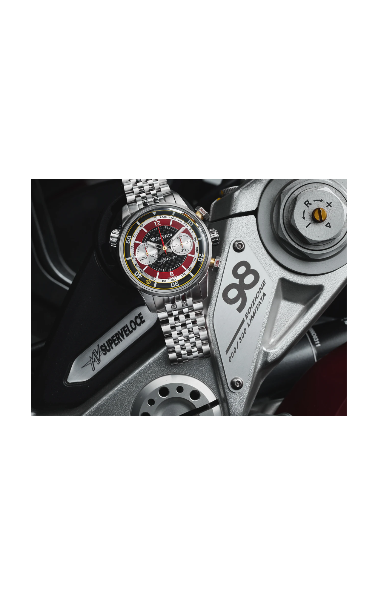 Il nuovo cronografo Wyler Vetta, in collaborazione con MV Agusta, nasce dalla costante ricerca della performance con uno stile originale. Ogni dettaglio dell'orologio è ispirato dai diversi componenti della Superveloce 98 edizione limitata, modello che celebra gli ottant'anni dal primo motore prodotto da MV.