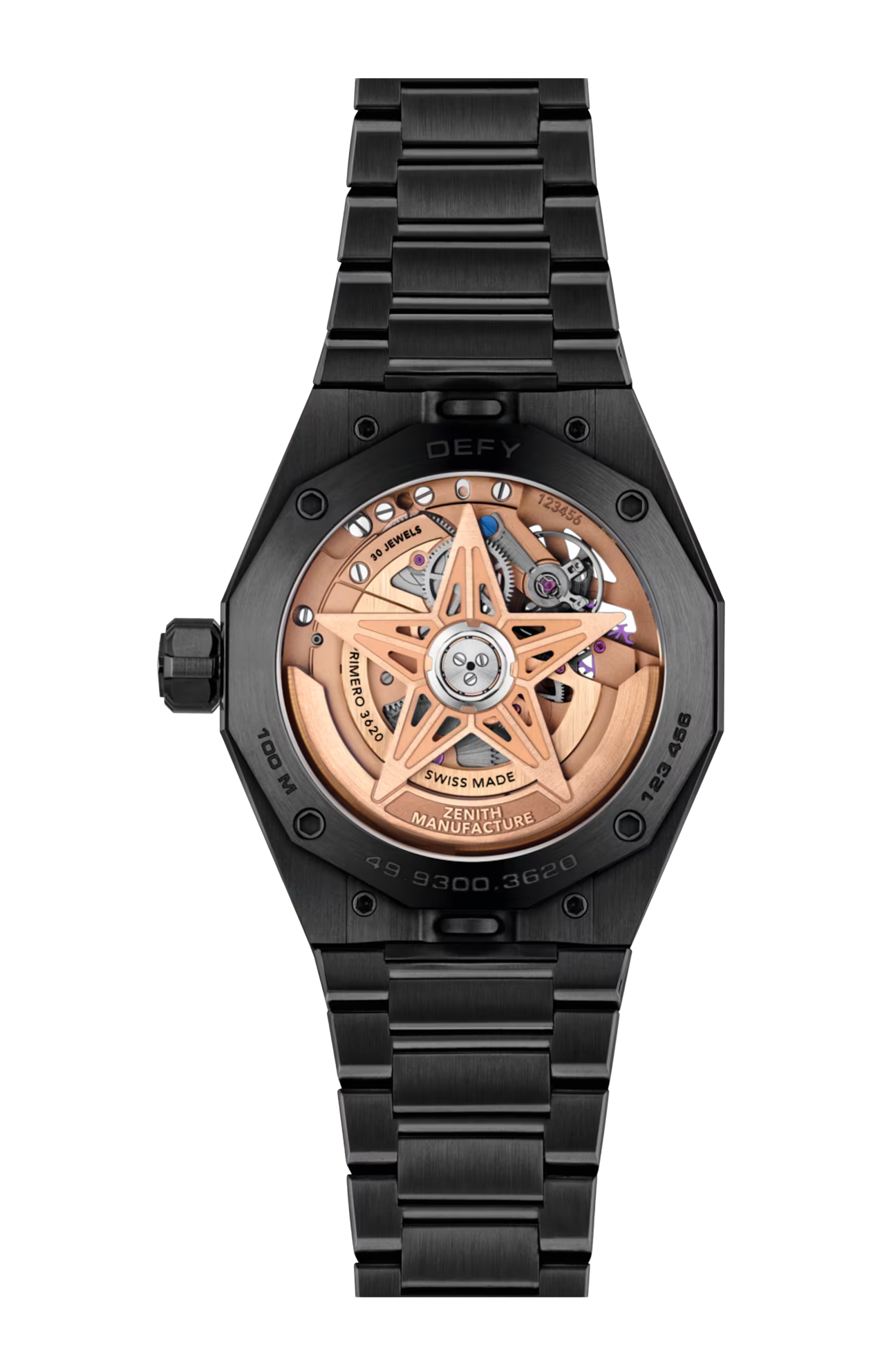 L’orologio DEFY Skyline Skeleton con cassa ottagonale in ceramica nera da 41 mm e lunetta sfaccettata si distingue per il quadrante aperto dorato, ispirato all’emblematica stella a quattro punte di ZENITH. Animato dal calibro El Primero 3620SK scheletrato, un movimento automatico ad alta frequenza con innovativo indicatore con precisione al 1/10 di secondo a ore 6. Dotato di un bracciale in ceramica nera e di un cinturino in caucciù nero con motivo, facilmente intercambiabili grazie all’ingegnoso sistema di sostituzione.