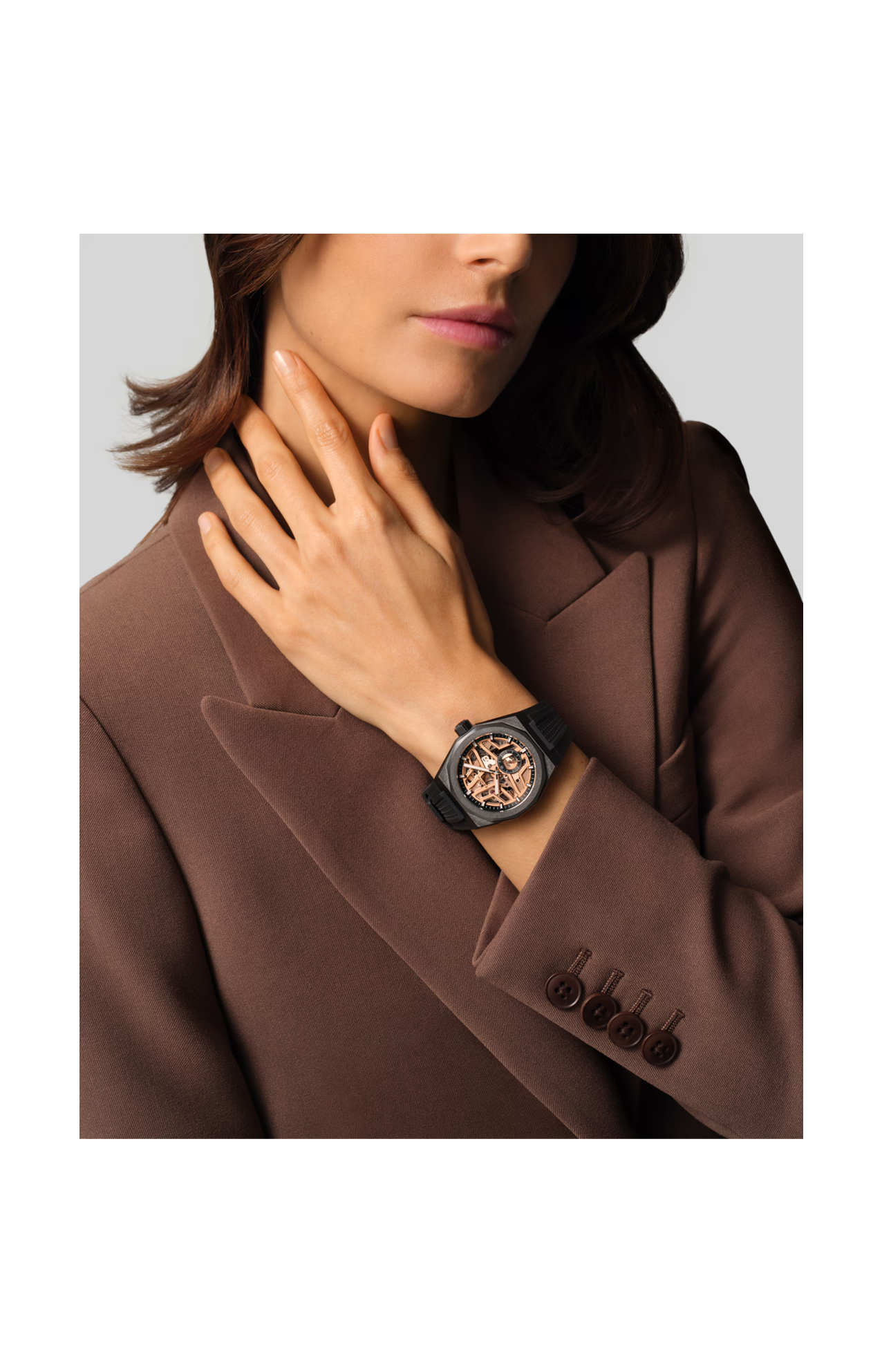 Richiamando le architetture in ombra e i caldi riflessi di una città illuminata di notte, il DEFY Skyline Skeleton in ceramica nera con quadrante e movimento dorato trova un equilibrio raffinato tra audacia ed eleganza. Il design gioca sui contrasti visivi tra geometrie scure e strutture traforate luminose, portando l’ombra sotto una nuova luce. La costruzione scheletrata svela il calibro El Primero 3620 SK, che anima l’indicatore con precisione di lettura al 1/10 di secondo, la cui rotazione costante ricorda il movimento perpetuo delle città moderne. Per una maggiore flessibilità estetica, il meccanismo di cambio rapido del cinturino permette di sostituire facilmente il bracciale in ceramica con il cinturino in caucciù nero incluso.