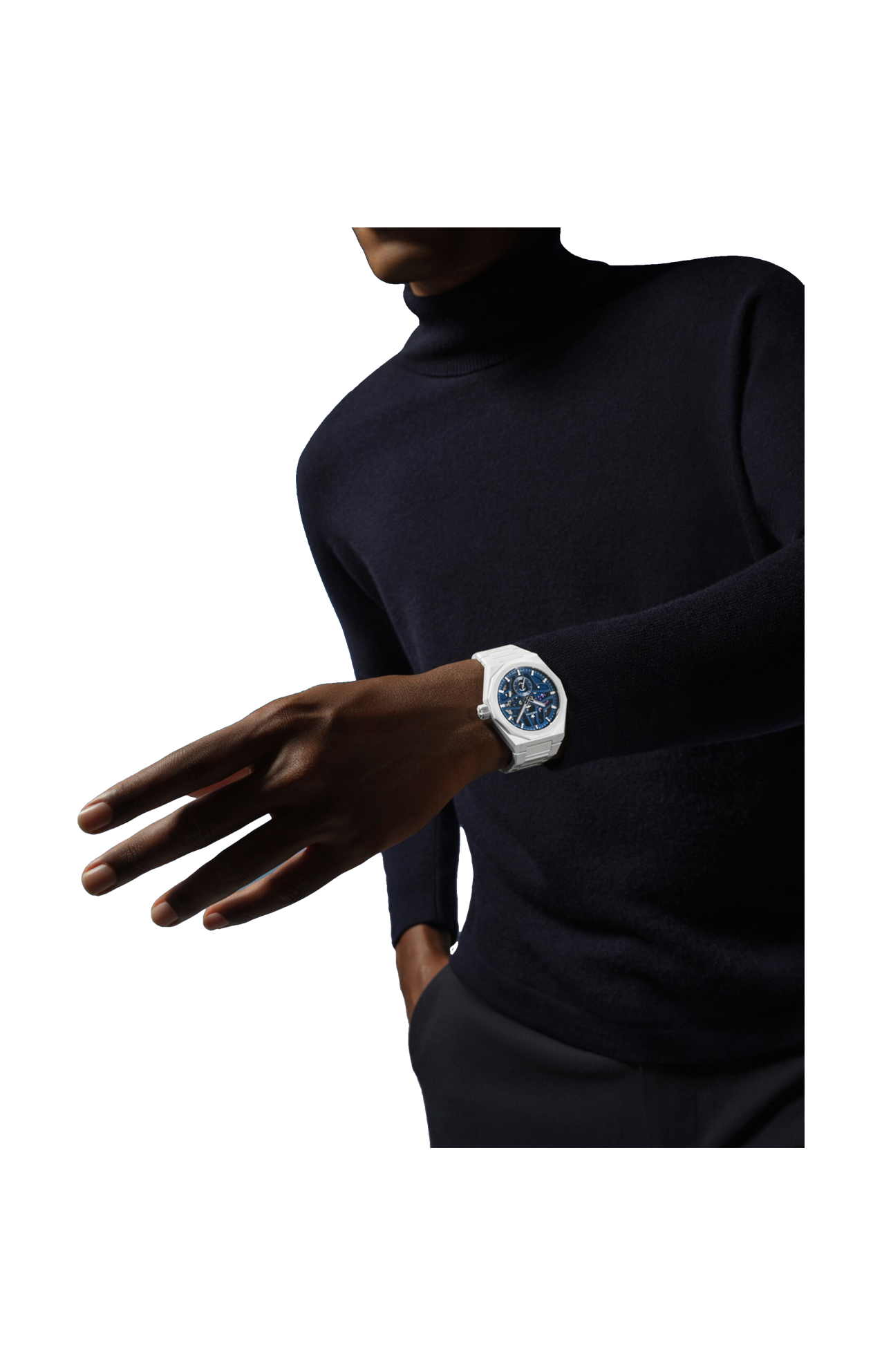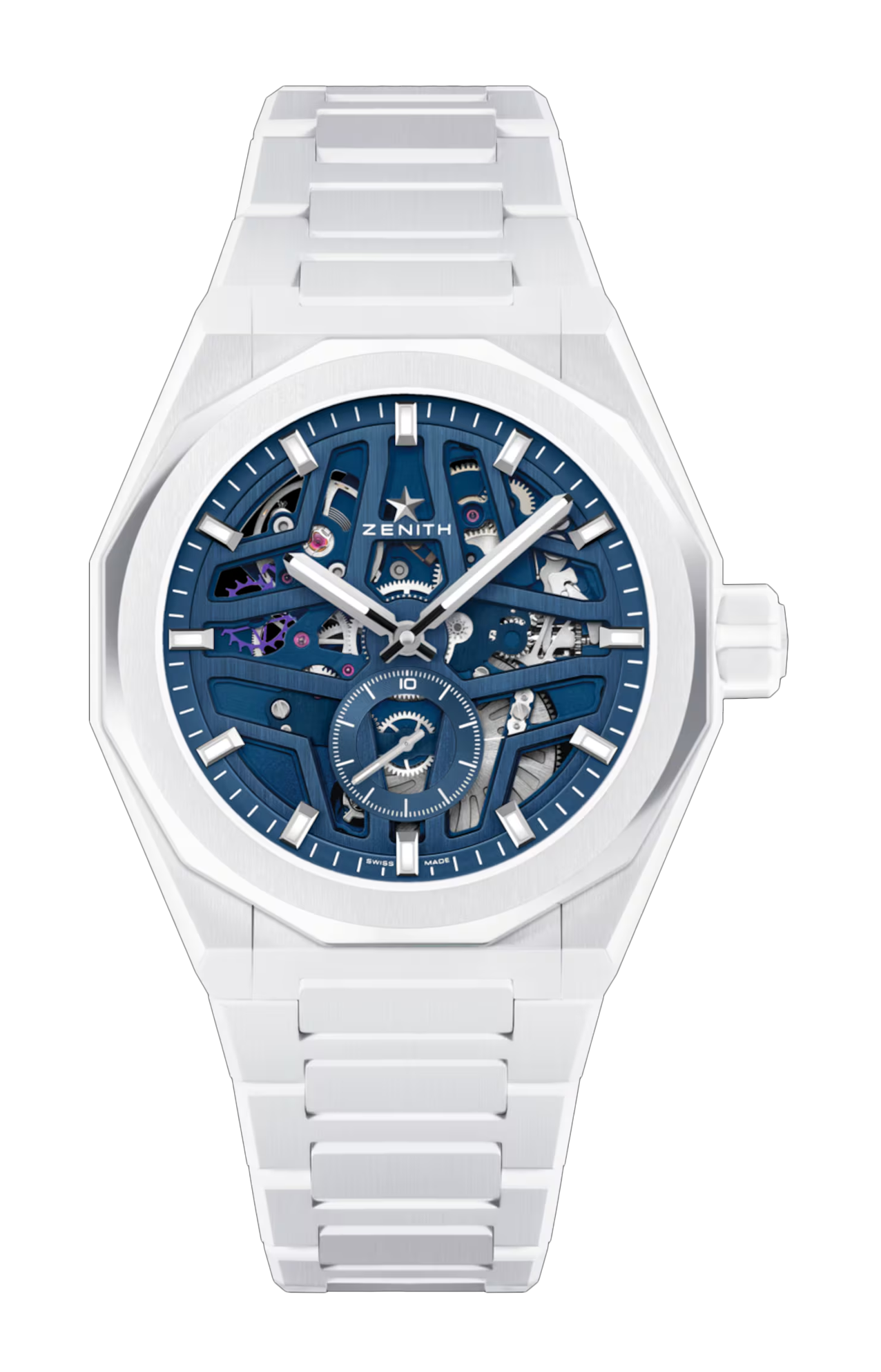 Il Defy Skyline Skeleton con cassa ottagonale in ceramica bianca da 41 mm e lunetta sfaccettata si distingue per il quadrante blu aperto, ispirato all’emblematica stella a quattro punte di Zenith. Animato dal movimento di manifattura automatico scheletrato ad alta frequenza El Primero 3620 SK, dotato del primissimo indicatore con precisione al 1/10 di secondo. Viene fornito con un bracciale in ceramica e un secondo cinturino in caucciù bianco con motivo per sperimentare appieno l’intercambiabilità.
