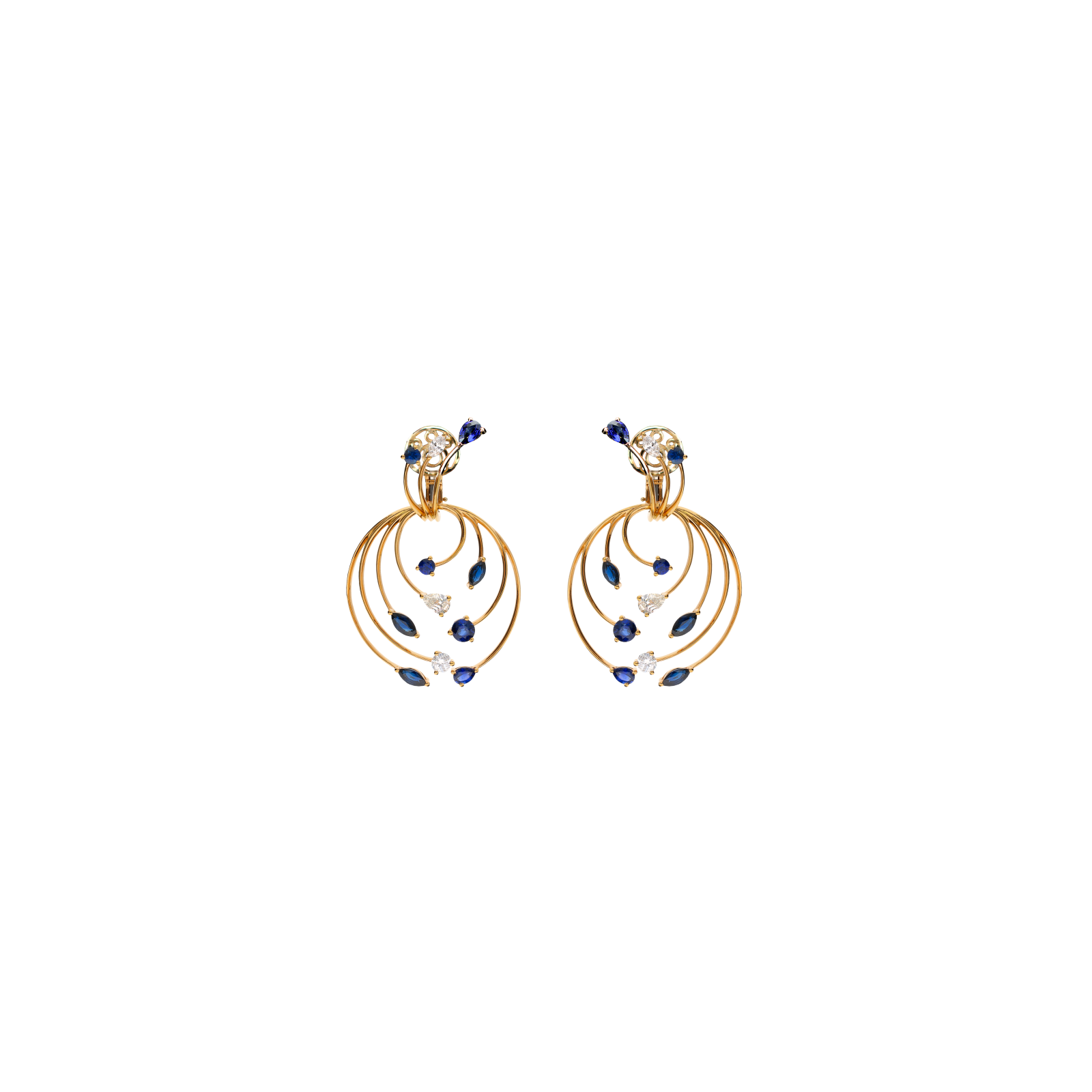 Orecchini collezione rami in oro rosa 18 carati con diamanti bianchi taglio brillante, taglio marquise e taglio goccia e zaffiri blu taglio brillante taglio goccia e taglio marquise