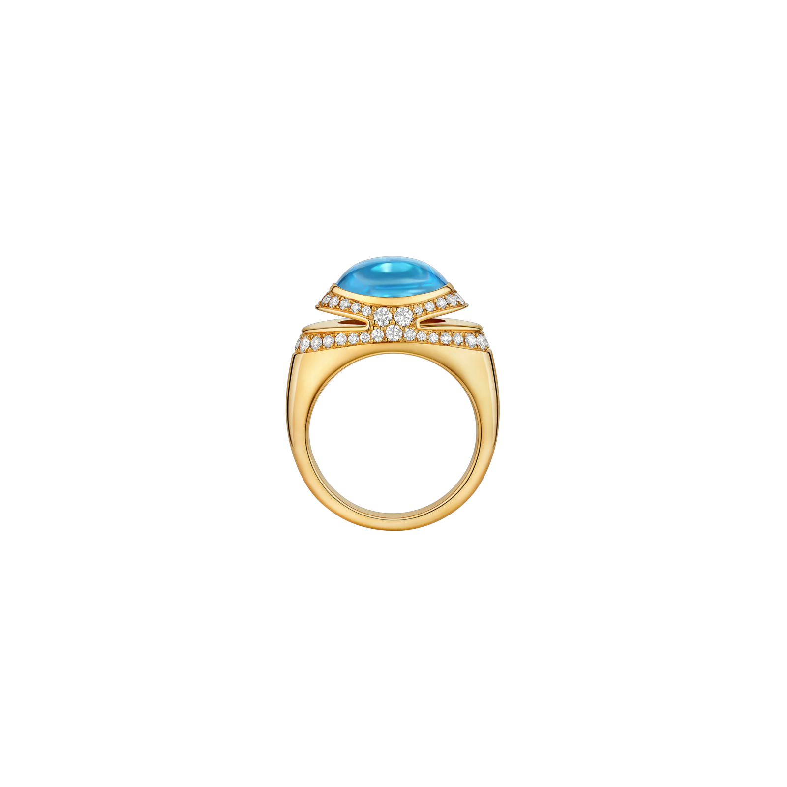 Come una goccia d’oro incastonata in una perfetta armonia di forme e volumi, l'anello Bvlgari Cabochon in oro giallo 18 kt è un talismano d’amore e di buona fortuna. Un simbolo prezioso che porta con sé una promessa d’amore eterno o un semplice augurio di felicità. Al cuore della creazione risplende un topazio azzurro taglio cabochon, un taglio che esalta l'intrinseca bellezza di ogni gemma, emblema dello stile Bvlgari sin dagli Cinquanta. Con il suo design dal fascino distintivo, il gioiello sublima lo splendore dell'oro e ne rivela l'assoluta purezza. A dare un tocco di preziosa luminosità alla creazione, un raffinato pavé di diamanti. Anello Bvlgari Cabochon in oro giallo 18 kt con topazio azzurro taglio cabochon e semi-pavé di diamanti.