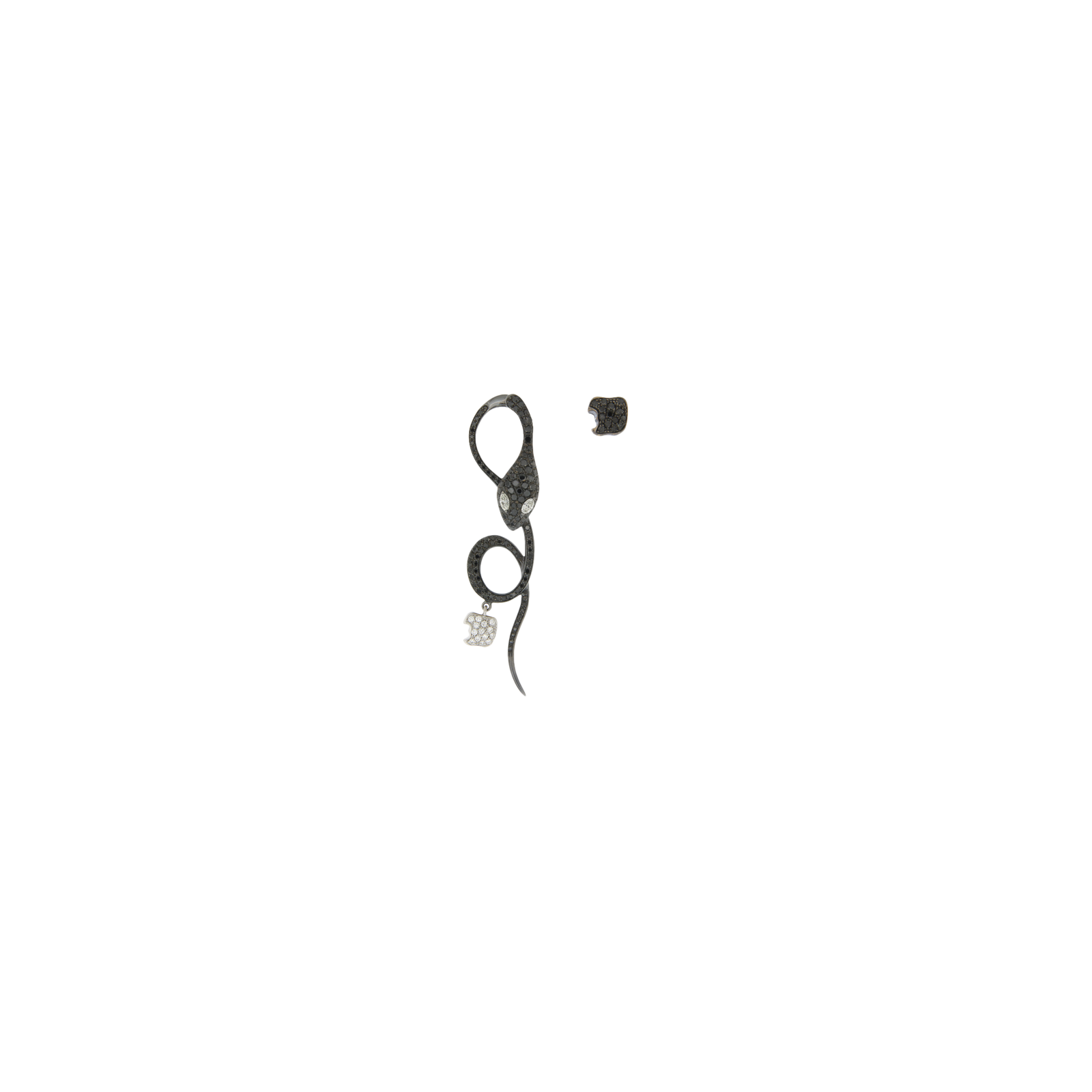 L'orecchino singolo full pavè della collezione Malafemmina è in oro 18K ed è caratterizzato da un serpente pavè con occhi in pietra preziosa taglio navettes. Una piccola mela morsa come pendente completa questo gioiello di grande impatto, frutto di una sapiente lavorazione dei nostri maestri artigiani. La chiusura a battente rende l'indosso estremamente confortevole. Nell'altro lobo è prevista una mela morsa pavè come completamento.
