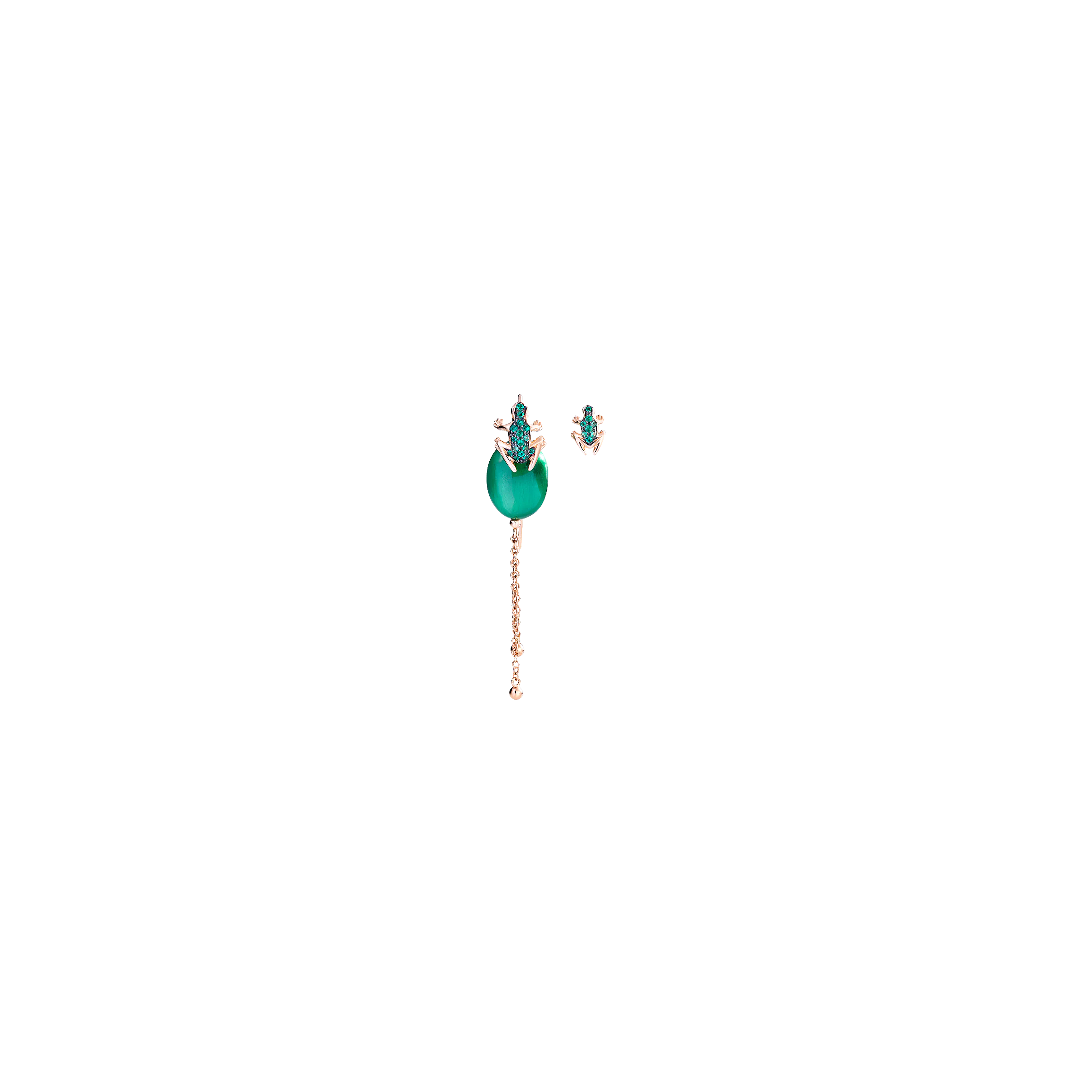 L'orecchino pendente della collezione Happy Frog è in oro 18K e smeraldi, la pepita è in argento 925 e il colore è ottenuto mediante un trattamento elettrolitico chiamato cataforesi. La rana rappresenta un vivace e ironico portafortuna che in questo gioiello prende vita e dona luce al viso. Un gioiello port-bonheur, colorato e gioioso, ideale per augurare il meglio alle persone a noi più care. La chiusura è ad amo.