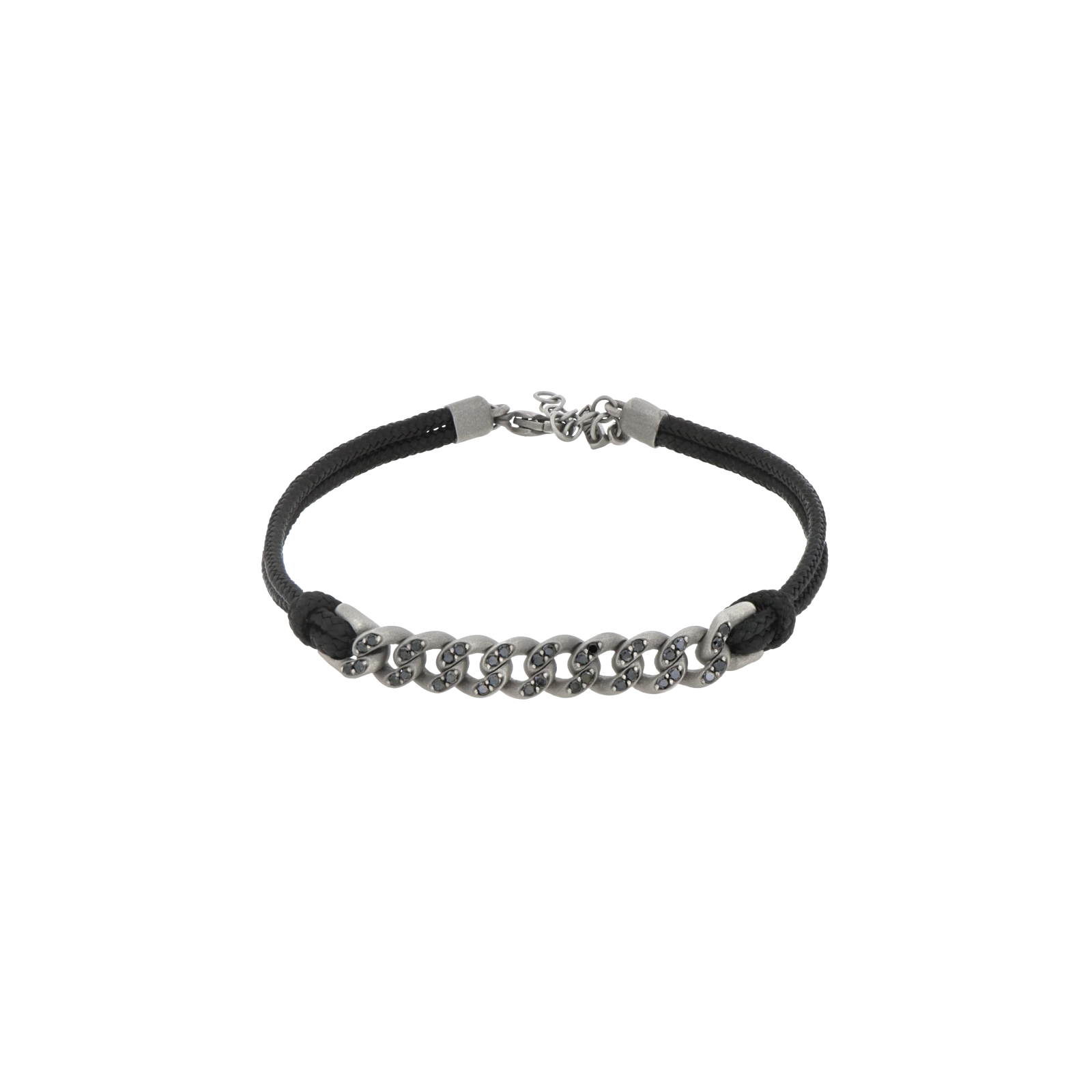 La robusta catena groumette è impreziosita da 36 diamanti neri (0.51 ct), creando un effetto di grande impatto. Il laccio nero aggiunge un tocco contemporaneo e confortevole, mentre la chiusura in titanio garantisce sicurezza e un'estetica minimalista. Come sigillo distintivo, la targhetta con logo MANO|J è affiancata da un prezioso diamante nero incastonato. Un gioiello artigianale made in Italy per l'uomo che ama distinguersi con stile.