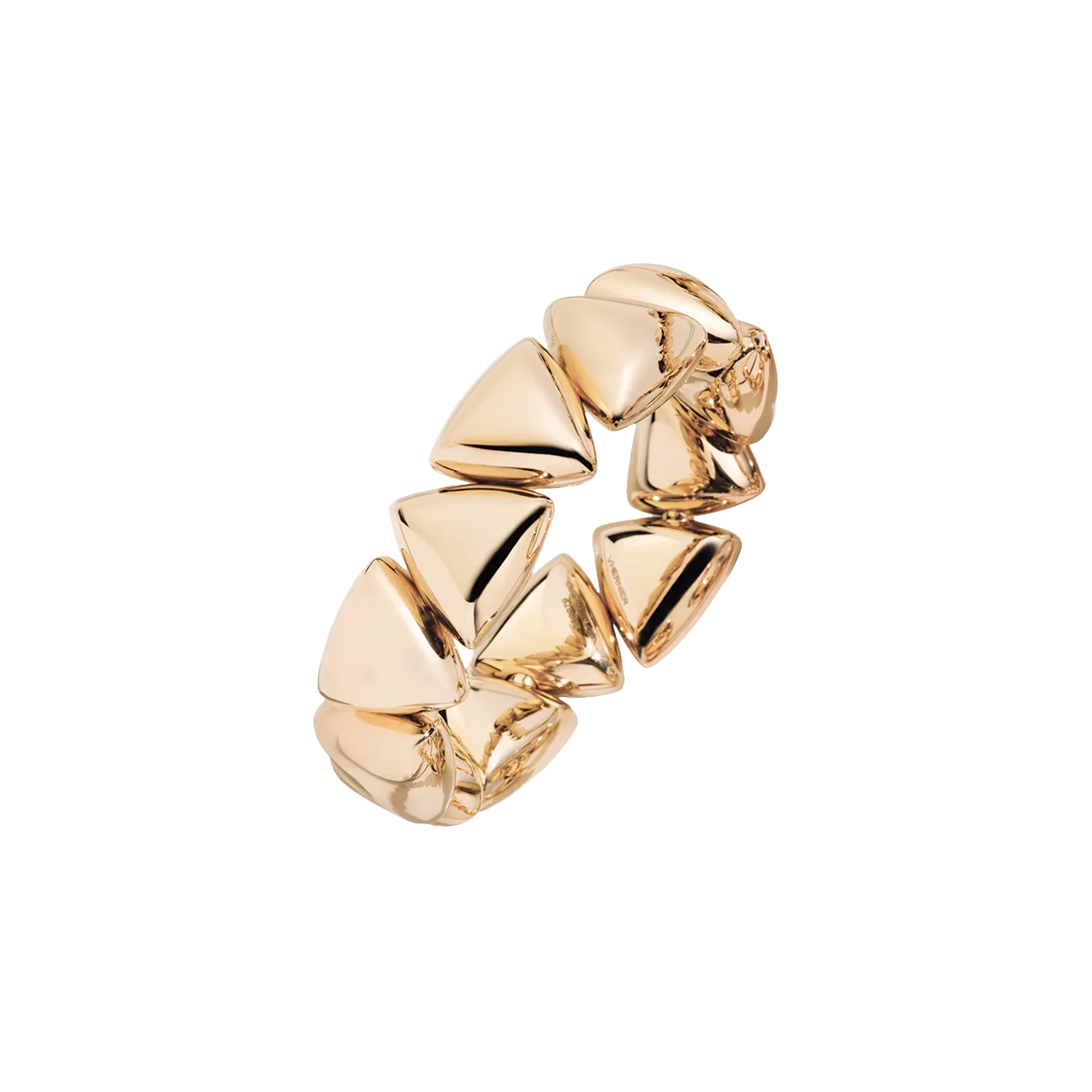 Il Freccia è un bracciale dal volume morbido in cui gli elementi di forma traingolare sono scolpiti nel classico oro rosa Vhernier.