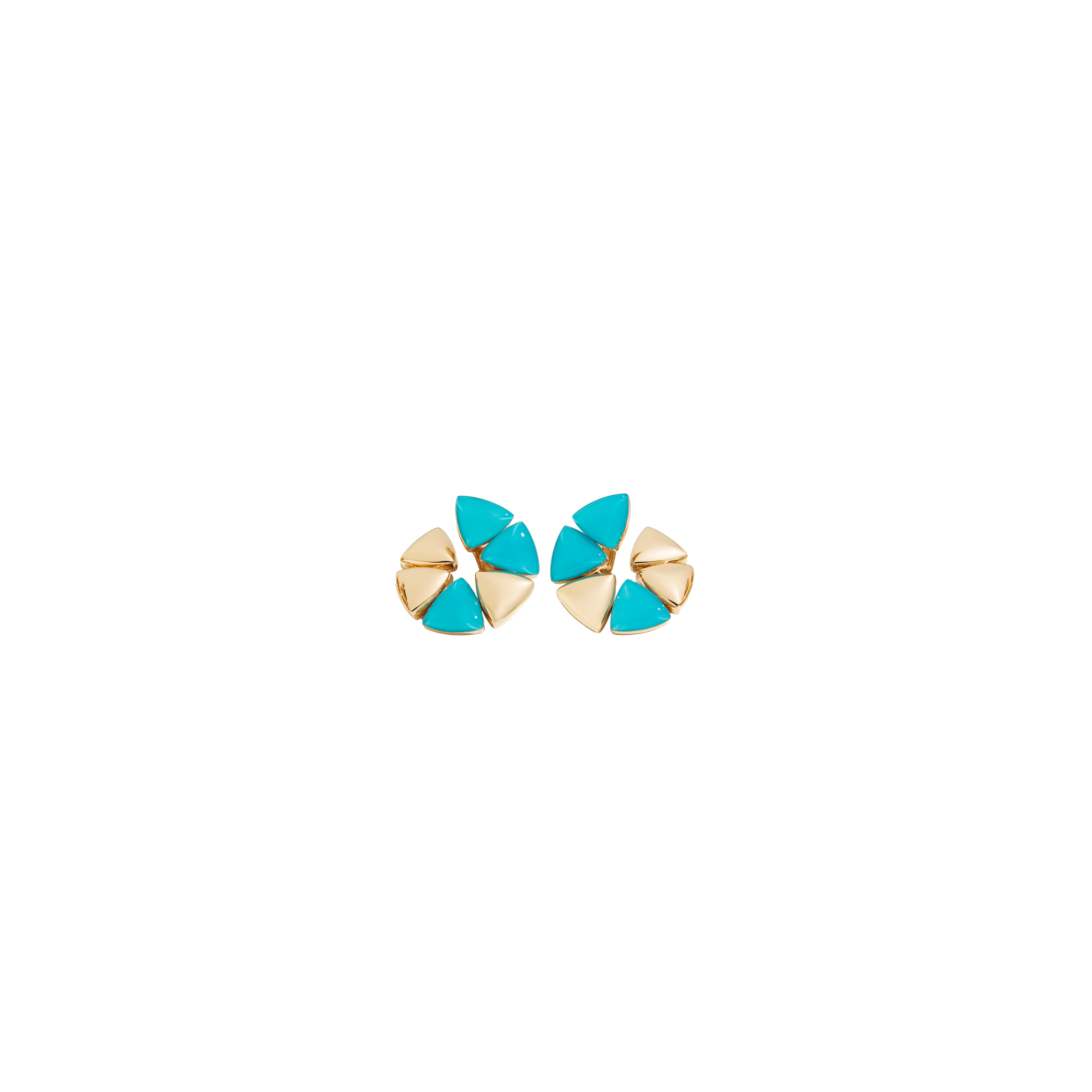 I Freccia di Vhernier sono orecchini a clip dal volume morbido e compatto; gli elementi triangolari, disposti a cerchio, creano una danza dinamica e vivace, alternando oro rosa 18K al bellissimo colore del turchere, reso più brillante dal cristallo di rocca.