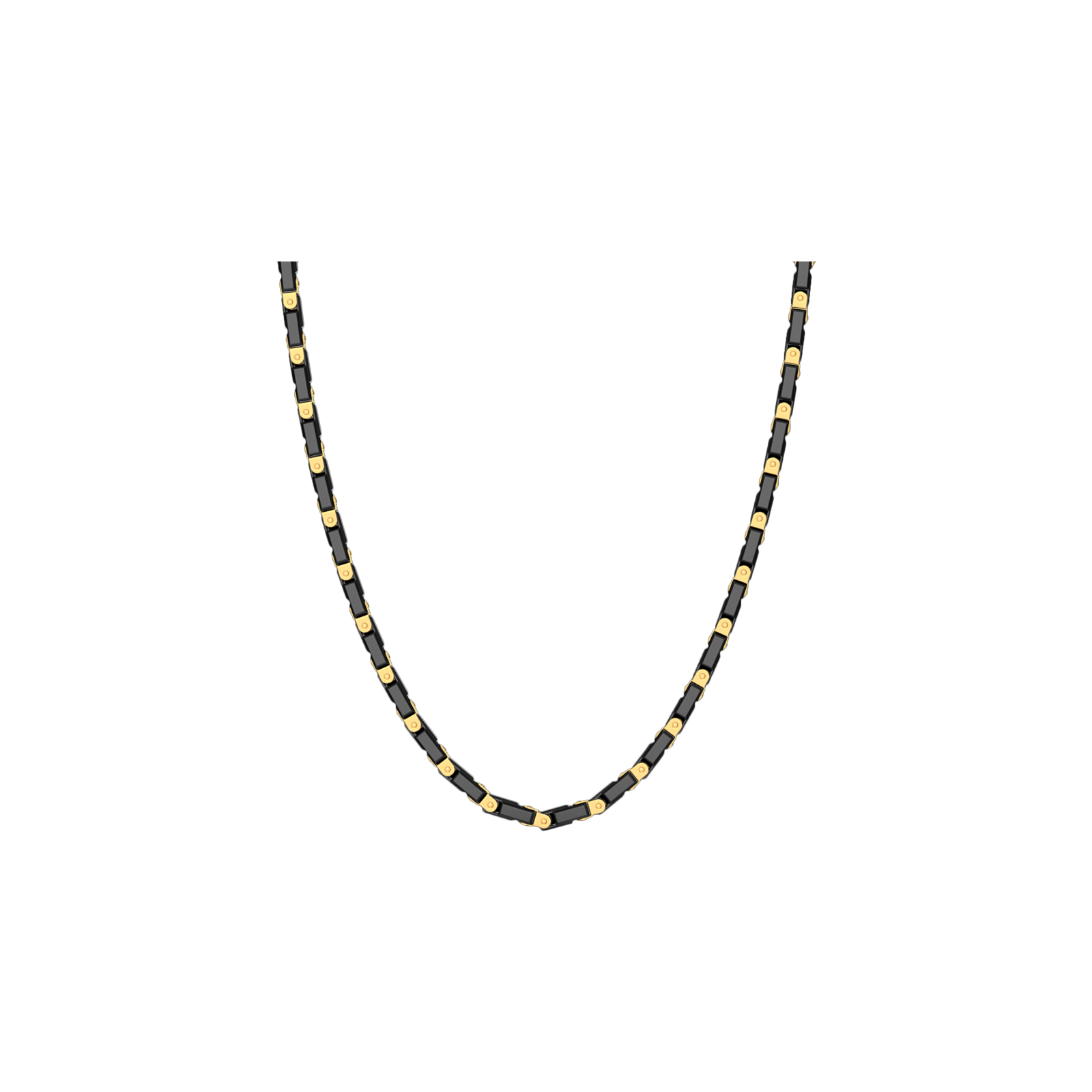Collana Zancan in oro 18kt e ceramica nera. La collana è composta da link geometrici e dettagli che donano un design meccanico e unico al gioiello. Gli elementi a colore in contrasto, i perni e il dettaglio accanto alla chiusura caratterizzano questa collana dal forte impatto visivo. Un gioiello di grande eleganza e dinamicità. La collana fa parte della collezione Ceramikgold, la collezione che unisce oro 18k e ceramica tramite complesse tecniche di lavorazione artigianale.