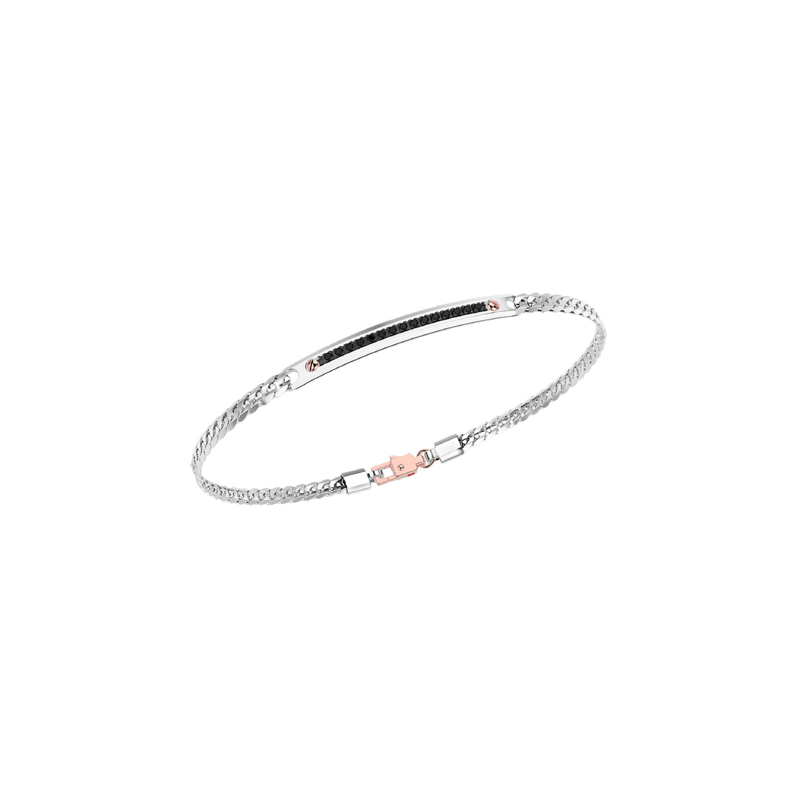 Bracciale Zancan in oro bianco 18 kt. Il bracciale è caratterizzato da una groumette in oro bianco, piastra centrale in oro rosa, ulteriormente impreziosita da diamanti neri sapientemente incassati. Appartiene alla collezione Insignia Explorer, che si caratterizza per il suo stile minimal e la ricercatezza nei dettagli. Interamente realizzato in Italia con un peso totale di circa 7,50 grammi.