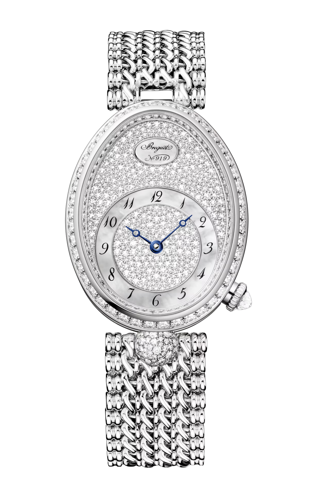 Il Breguet Reine de Naples 8938BB/8DJ/20D0 è un segnatempo femminile di raffinata eleganza che incarna l’arte orologiera classica arricchita da un’estetica preziosa e senza tempo. La cassa ovale in oro bianco 18 K, dalle linee armoniose e morbide, è impreziosita da una lunetta completamente incastonata con diamanti taglio brillante di alta qualità, che catturano la luce con una luminosità intensa e sofisticata, conferendo al segnatempo un’eleganza luminosa. Il quadrante madreperla, con la sua iridescenza naturale, presenta numeri Breguet elegantemente curvati e lancette sottili blued steel, creando un insieme raffinato e leggibile che celebra l’estetica classica della Maison. Il vetro zaffiro bombato antigraffio protegge ogni dettaglio del quadrante e ne esalta la profondità visiva, mentre il fondello in vetro zaffiro consente di ammirare il movimento meccanico automatico di alta precisione al suo interno, progettato per garantire affidabilità e performance costanti. Il cinturino in oro bianco 18 K completa il design con comfort e stile, rendendo questo segnatempo ideale sia per momenti formali sia come simbolo di eleganza nel quotidiano. Il Reine de Naples 8938BB/8DJ/20D0 è molto più di un semplice orologio: è un gioiello d’alta orologeria che celebra la femminilità, la tradizione e la bellezza senza tempo in un’estetica elegante e sofisticata.