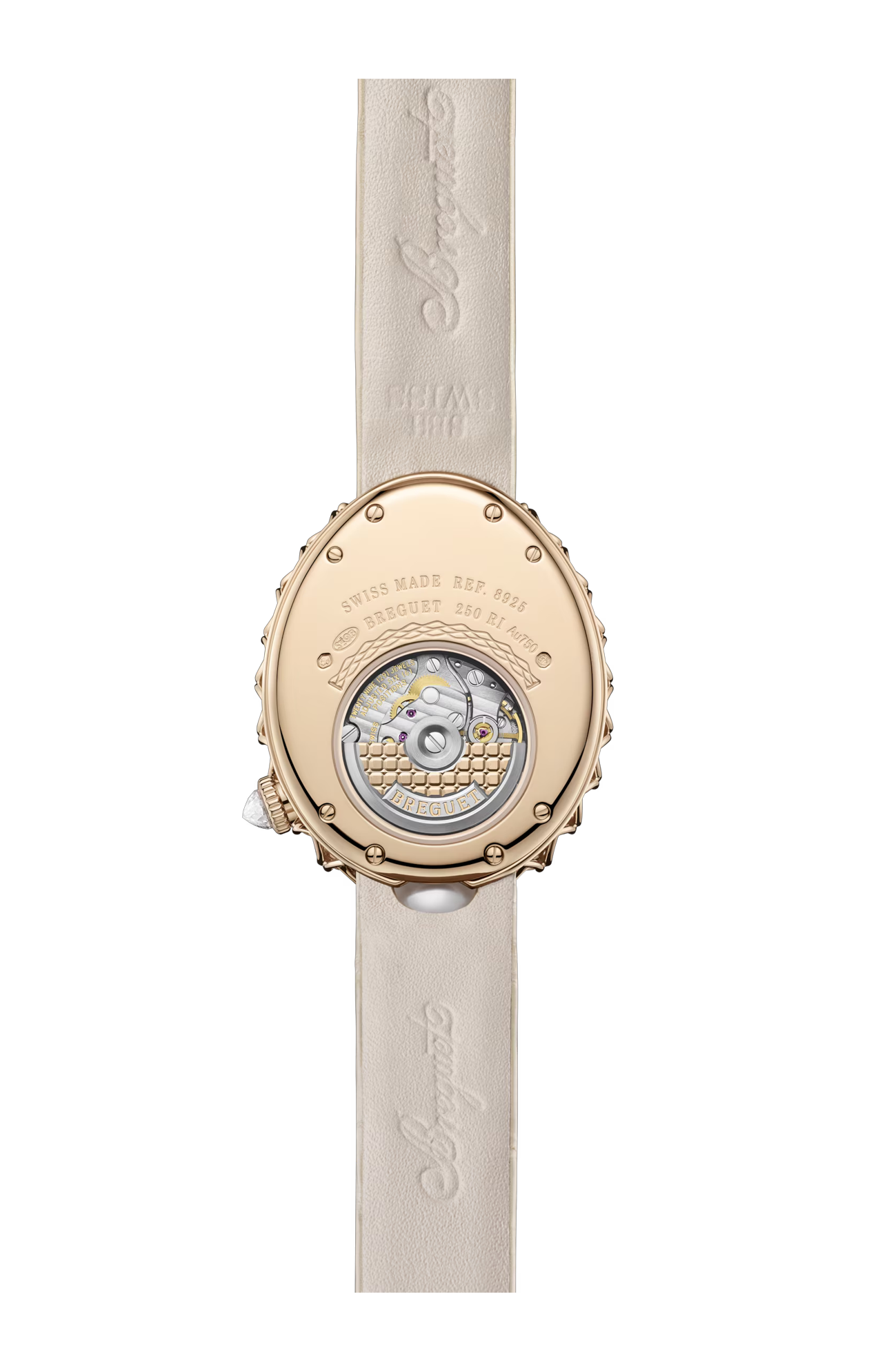 Il Breguet Reine de Naples Perles Impériales GJ29BH/8925/4D59 è un segnatempo di altissima gioielleria che incarna l'eleganza regale e l'arte orologiera senza compromessi, pensato per chi desidera un accessorio di straordinaria raffinatezza e femminilità. La cassa ovale in oro Breguet 18 K, con proporzioni morbide e armoniose, è impreziosita da una doppia fila di diamanti taglio brillante lungo la lunetta e il profilo, catturando la luce con una brillantezza pura e luminosa. Il quadrante madreperla, delicato e iridescente, è sottolineato da una magnifica decorazione perlacea con perle naturali che si fondono in un motivo elegante e unico, mentre indici sottili e lancette Breguet in acciaio azzurrato offrono una leggibilità raffinata. Il vetro zaffiro bombato antigraffio protegge e valorizza ogni dettaglio del quadrante, aggiungendo profondità visiva all'intera composizione. All'interno pulsa un movimento meccanico automatico di alta precisione, progettato per garantire affidabilità e performance costanti, riflettendo la maestria orologiera della Maison. Il cinturino in pelle di alta qualità completa l'insieme con comfort e stile, rendendo questo segnatempo ideale per occasioni formali ma anche come simbolo di eleganza quotidiana per chi ama esprimere la propria personalità con un tocco di lusso discreto. Il Reine de Naples Perles Impériales è molto più di un orologio: è un gioiello da polso che celebra la tradizione, la poesia e l'eccellenza tecnica con un'estetica senza tempo.