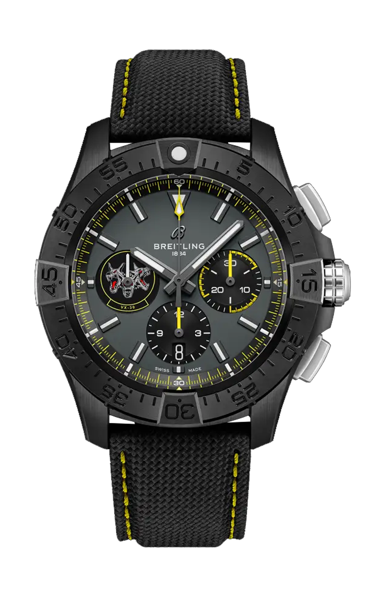 Ideato per i piloti di jet, l’Avenger è progettato per affrontare le cabine di pilotaggio più ardue, senza mai tirarsi indietro. Queste edizioni sono dedicate all’Accademia Navale degli Stati Uniti e a due delle squadriglie elitarie di collaudo aereo della marina statunitense: i Dust Devils e i Bloodhounds. Ma non serve essere un asso dell’aviazione per apprezzarne l’audace design, l’eccezionale resilienza e la funzionalità sempre un passo avanti. Ogni versione presenta l’emblema e lo schema cromatico dell’unità – rosso e nero per i Dust Devils, grigio e giallo per i Bloodhounds, blu e giallo per l’Accademia Navale degli Stati Uniti – nonché un’incisione dedicata che circonda la vista del fondocassa aperto del calibro di manifattura Breitling 01. Tutte e tre presentano casse in ceramica nera e minuteria in titanio, abbinate a cinturini in pelle militare con ricami a contrasto. Il tonneau a botte non sarà forse per tutti, ma chiunque apprezzerà ogni minimo dettaglio della loro impermeabilità fino a 300 m, la maneggevole funzionalità e la costruzione resistente alla corrosione.
