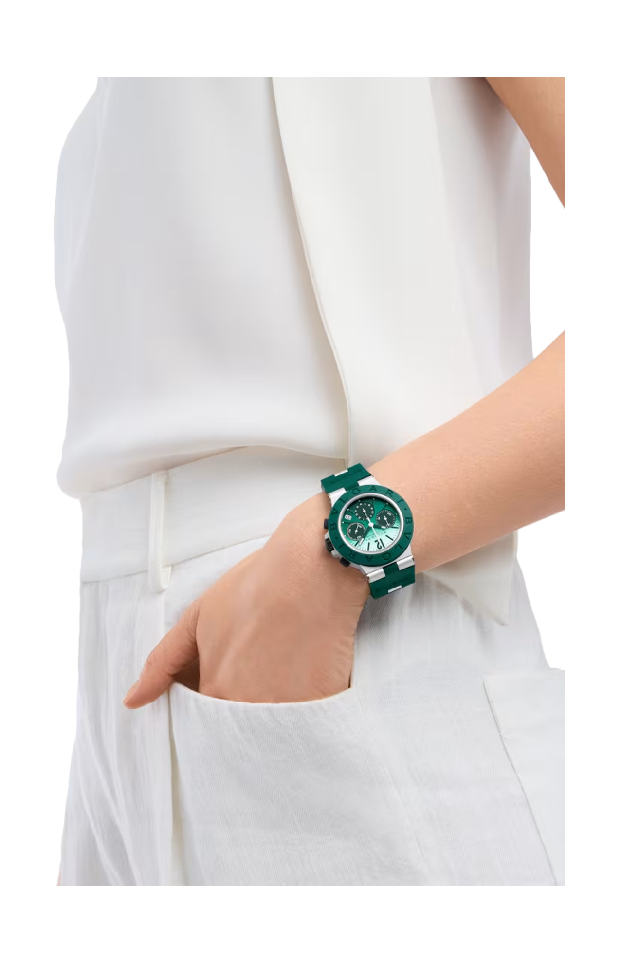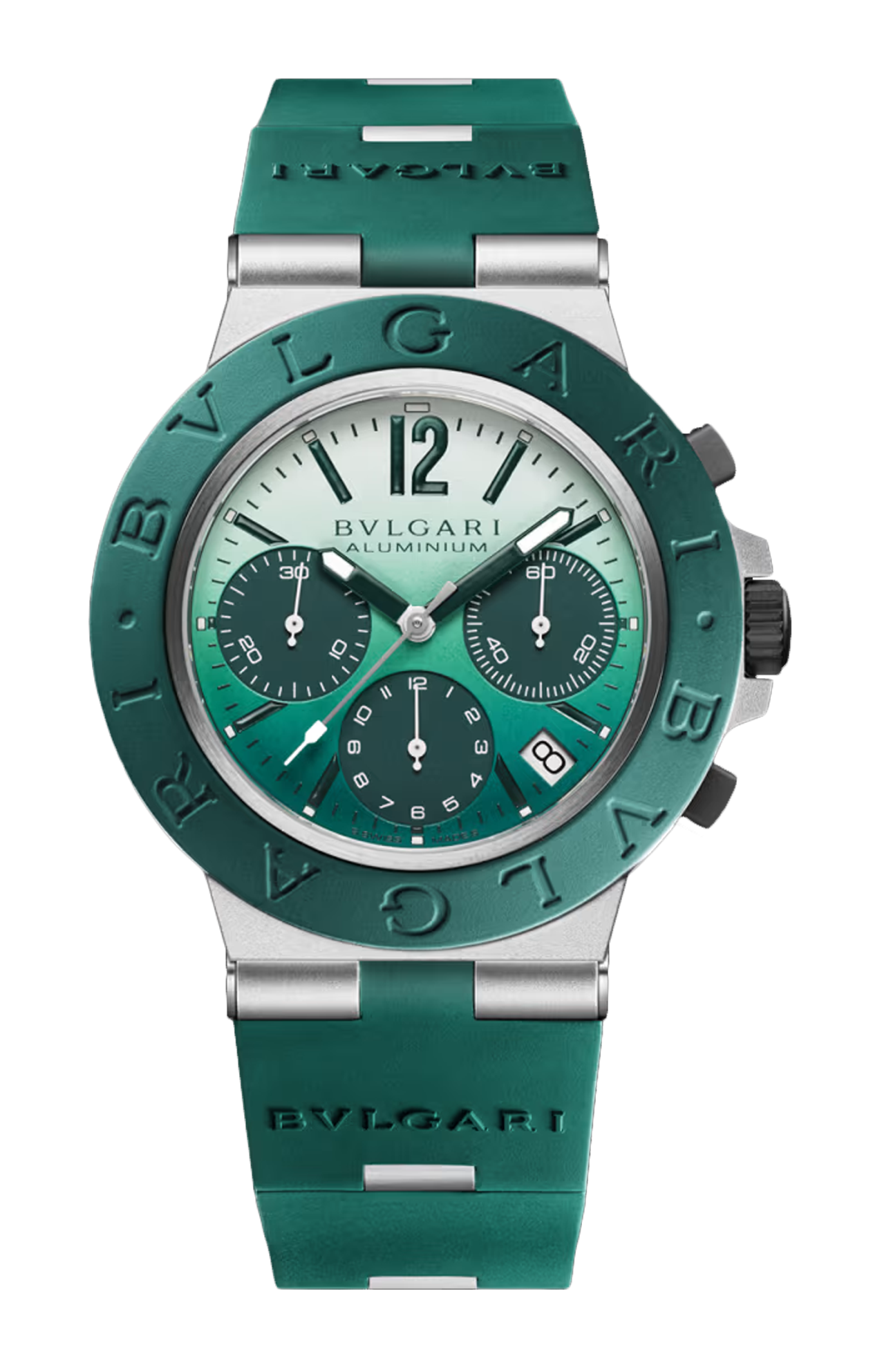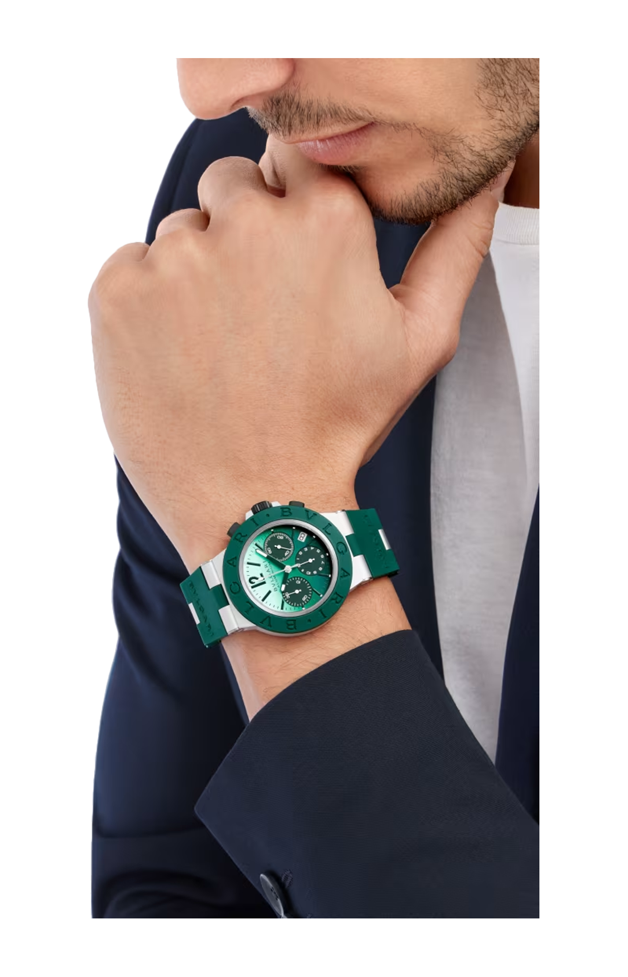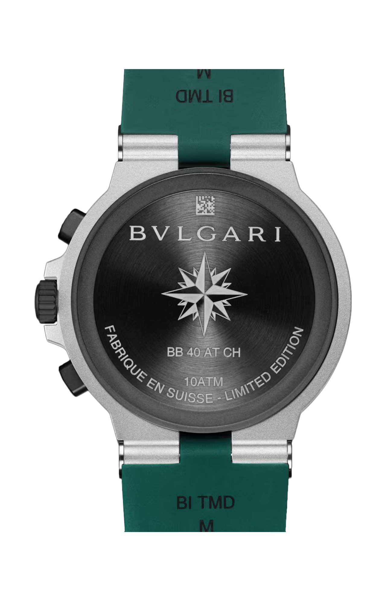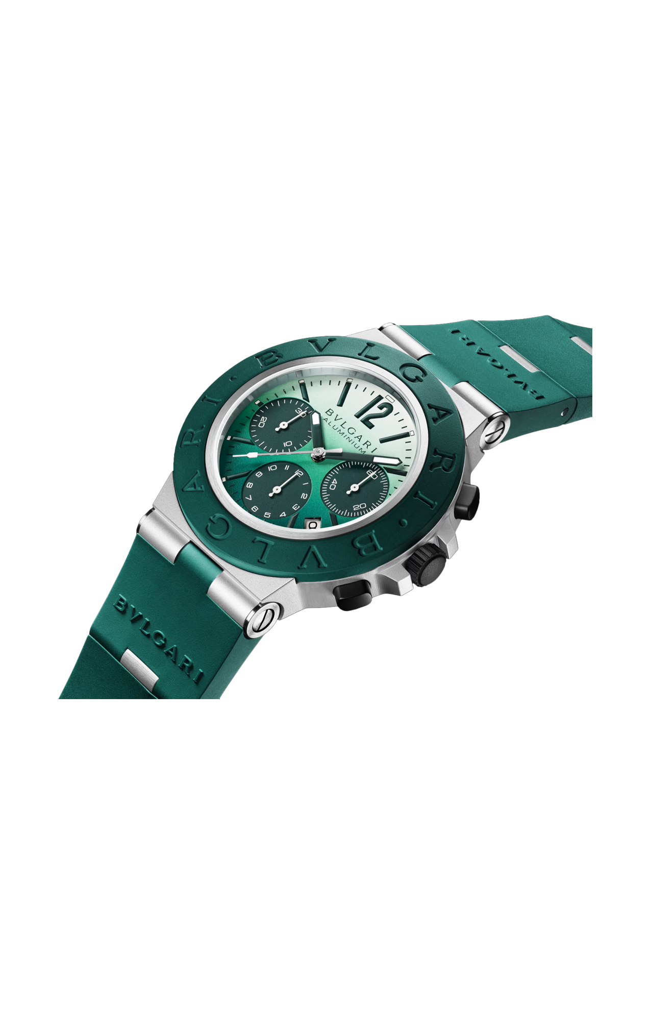 Orologio BVLGARI Aluminium Smeraldo Special Edition con movimento meccanico di manifattura a carica automatica, cronografo, funzioni ore, minuti, secondi e data, calibro B130, riserva di carica di 42 ore, cassa di 40 mm in alluminio, lunetta in caucciù verde scuro con incisione BVLGARI BVLGARI, corona in titanio con trattamento DLC, quadrante dégradé verde, indici bianchi e verde scuro con SLN, lancette ore e minuti blu scuro con SLN, lancetta dei secondi argento con punta bianca, lancette dei sottoquadranti di colore bianco, fondello in titanio con trattamento DLC e incisione della rosa dei venti, cinturino in caucciù verde scuro con anse in alluminio e fibbia ad ardiglione. Impermeabile fino a 100 metri. Edizione limitata da 1.000 pezzi. Edizione limitata a 1000 esemplari