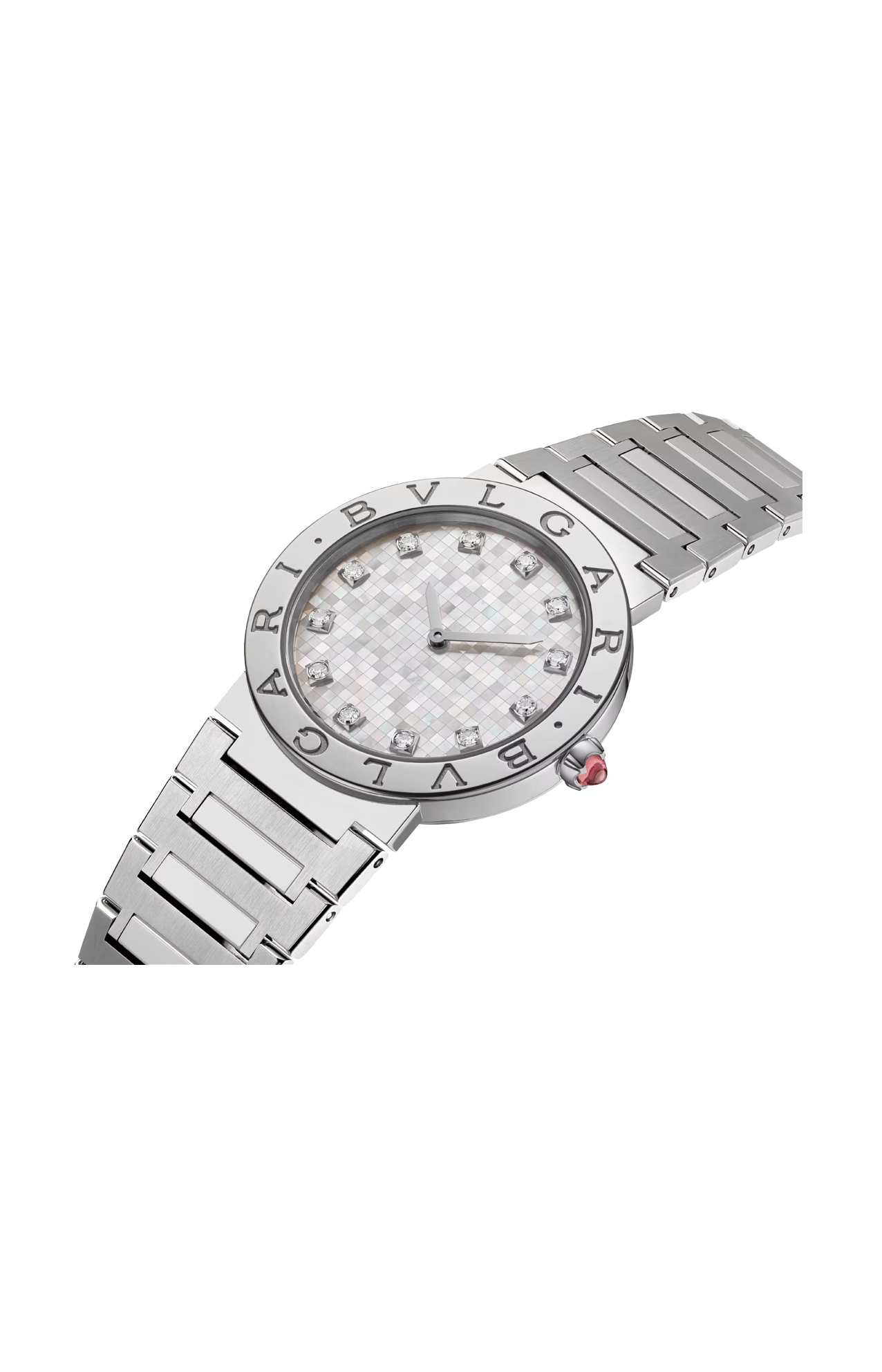 Orologio BVLGARI BVLGARI con movimento al quarzo, funzioni ore e minuti, cassa di 33 mm in acciaio inossidabile lucido e lunetta con doppio logo, quadrante a mosaico in madreperla bianca, indici con 12 diamanti tondi taglio brillante, corona in acciaio inossidabile con rubellite rosa taglio cabochon e bracciale con fibbia DÉPLOYANTE in acciaio inossidabile lucido e satinato-spazzolato. Impermeabile fino a 30 metri.