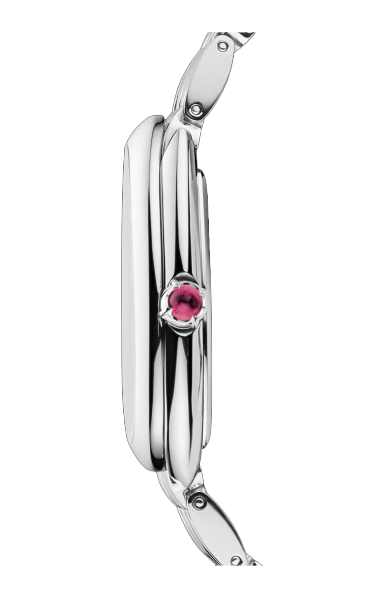 Orologio Serpenti Seduttori con movimento al quarzo, cassa di 33 mm e lunetta in acciaio inossidabile, corona in acciaio inossidabile con rubellite rosa taglio cabochon, quadrante laccato nero, bracciale con fibbia déployante in acciaio inossidabile. Impermeabile fino a 30 metri.
