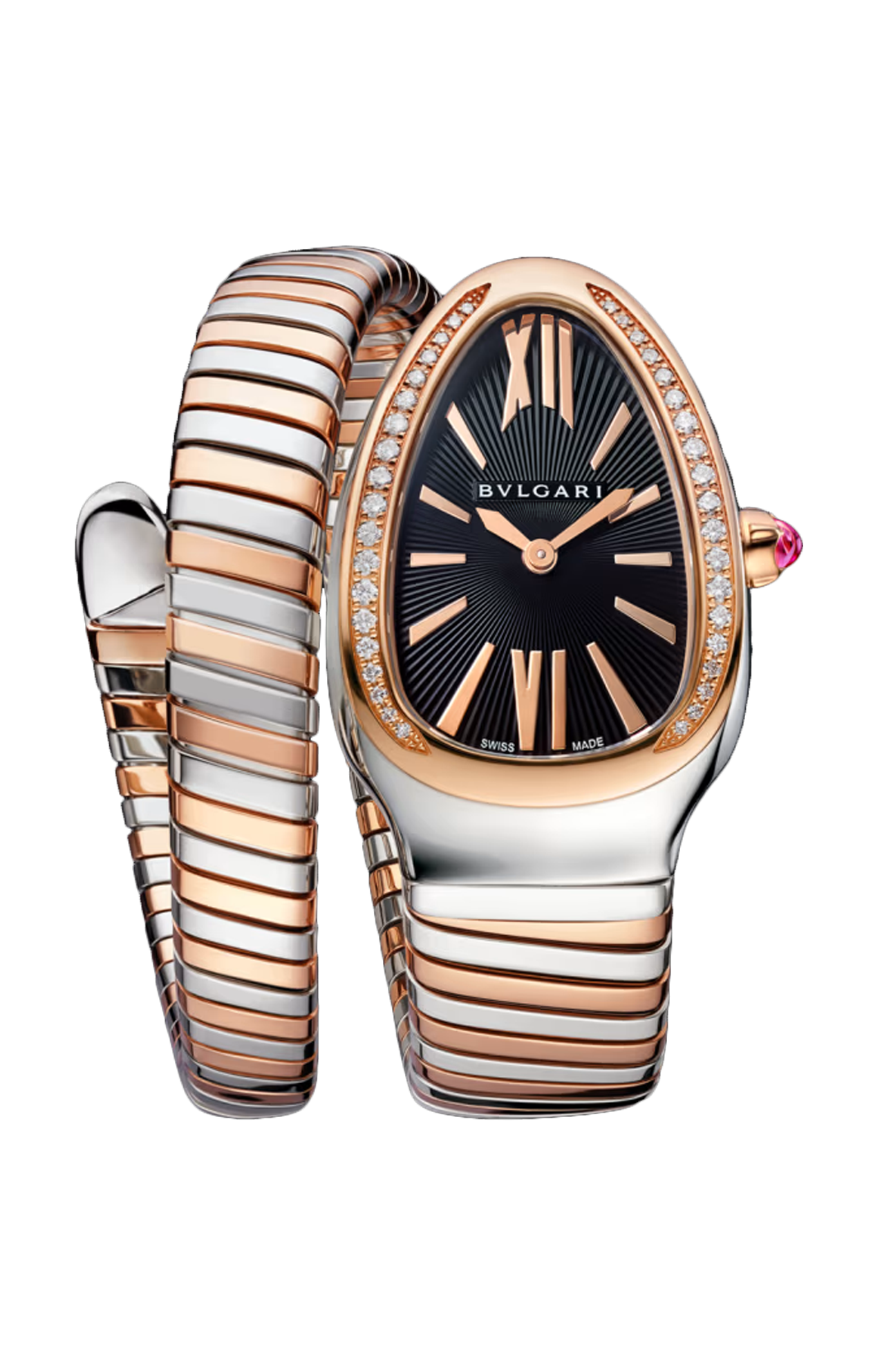 Orologio Serpenti Tubogas con movimento al quarzo, cassa curva di 35 mm in acciaio inossidabile, lunetta in oro rosa 18 kt con diamanti taglio brillante, corona in oro rosa 18 kt con rubellite rosa taglio cabochon, quadrante opalino nero con finiture guilloché soleil e indici applicati a mano, bracciale a spirale in oro rosa 18 kt e acciaio inossidabile.