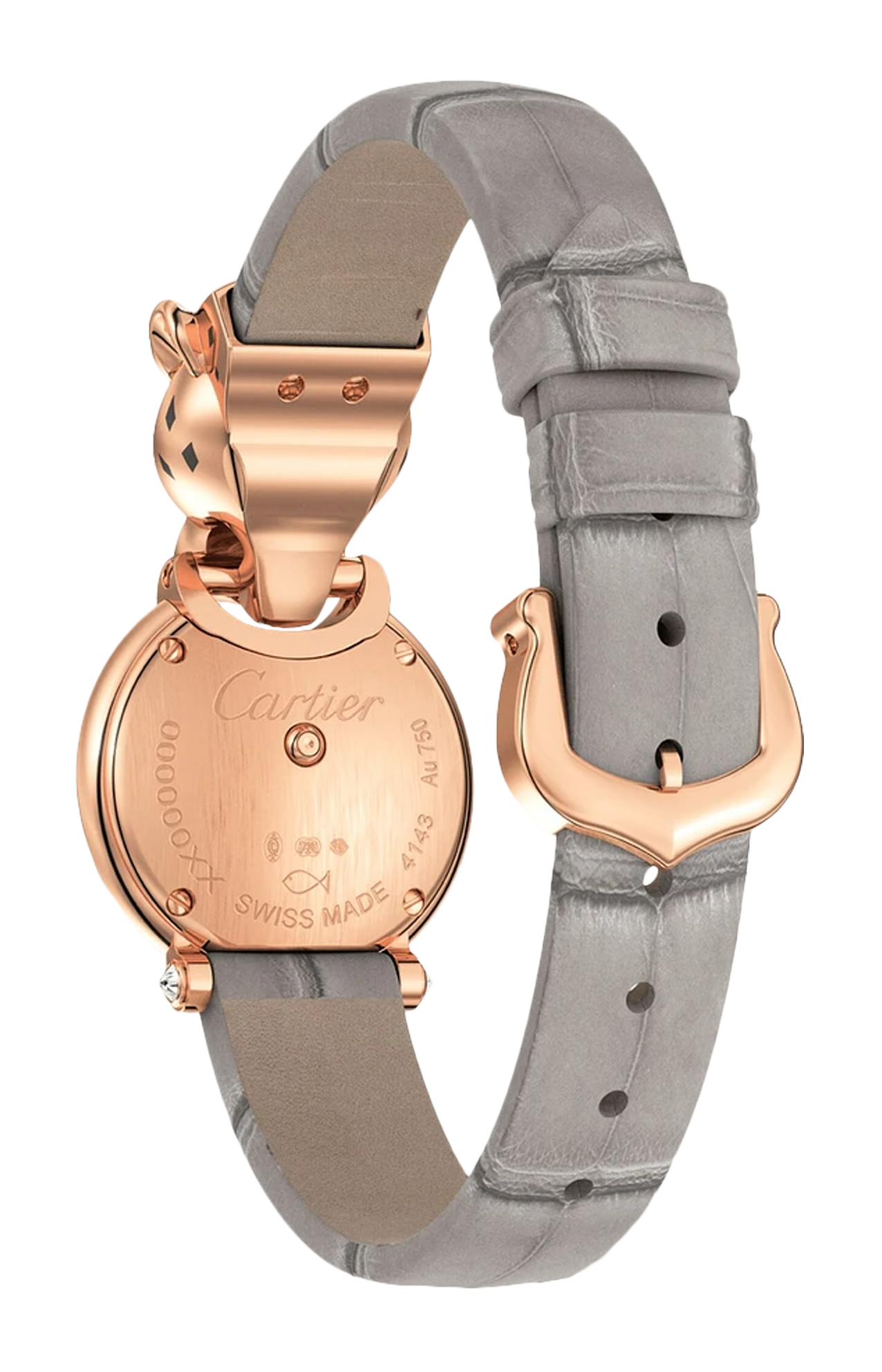 Orologio La Panthère, 23,6 mm, movimento a quarzo. Cassa in oro rosa 750/1000 ornata di 40 diamanti taglio brillante (0,24 carati), testa di pantera in oro rosa 750/1000, occhi di tsavorite forma poire (0,16 carati), macchie e naso in lacca nera, quadrante rosato, lancette a forma di gladio d’acciaio azzurrato, cinturino d’alligatore semi-opaco grigio chiaro, fibbia ardiglione in oro rosa 750/1000. Spessore 7,7 mm. Impermeabile fino a 30 metri.