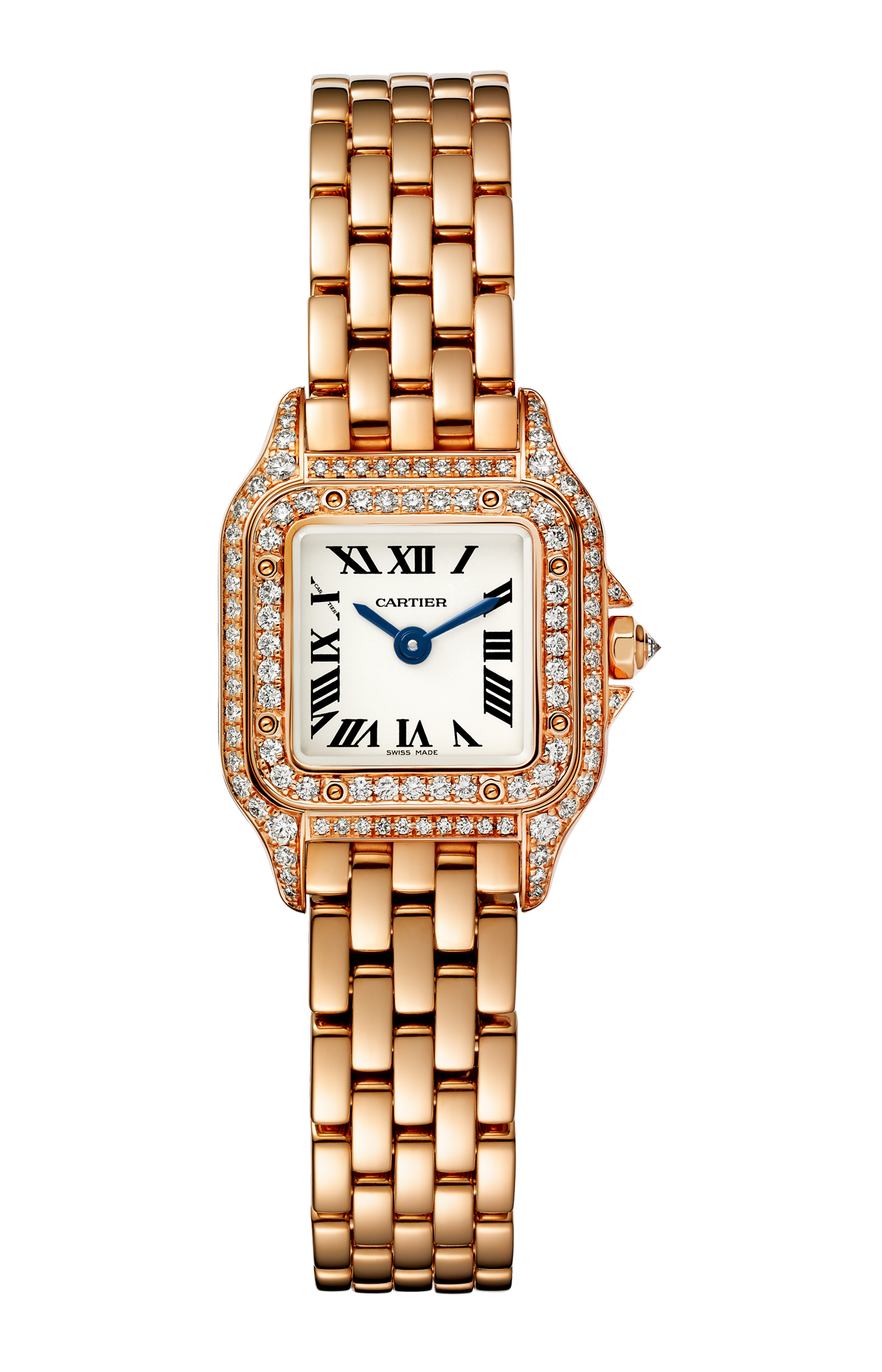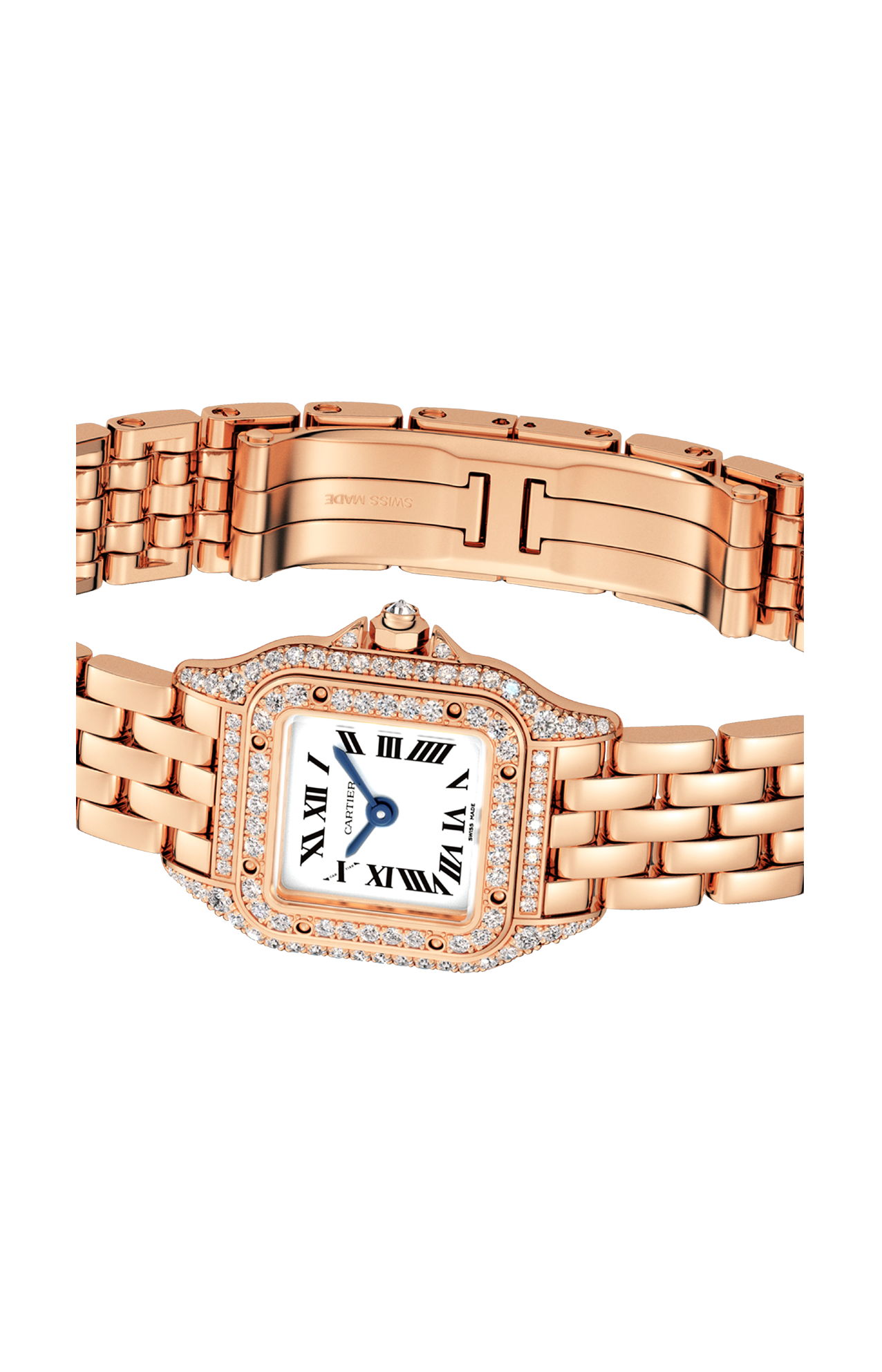 Orologio Panthère de Cartier, modello mini, movimento a quarzo. Cassa in oro rosa 750/1000 ornata di diamanti taglio brillante. Corona ottagonale in oro rosa 750/1000 ornata di un diamante taglio brillante. Quadrante argentato, lancette a forma di gladio d’acciaio azzurrato, vetro zaffiro. Bracciale in oro rosa 750/1000. Dimensioni 25 x 20 mm, spessore 6 mm. Impermeabile fino a 30 metri. Foto non contrattuale (la lunghezza del bracciale dell’orologio può variare leggermente).