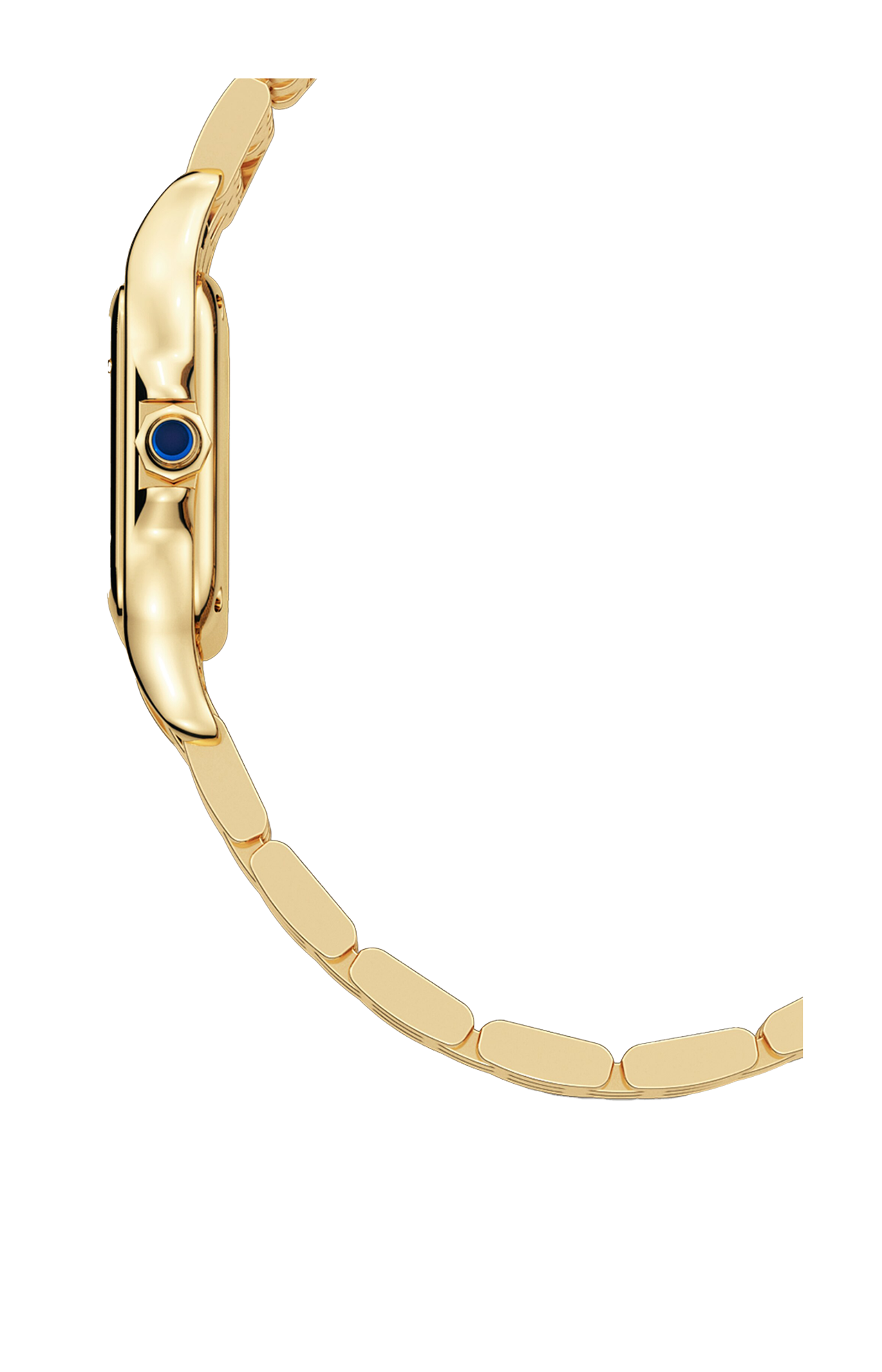 Orologio Panthère de Cartier, modello piccolo, movimento a quarzo. Cassa in oro giallo 750/1000, dimensioni 23 x 30 mm, spessore 6 mm, corona ornata di uno zaffiro blu, quadrante argentato, lancette a forma di gladio d'acciaio azzurrato, bracciale in oro giallo 750/1000, impermeabile fino a 30 metri.